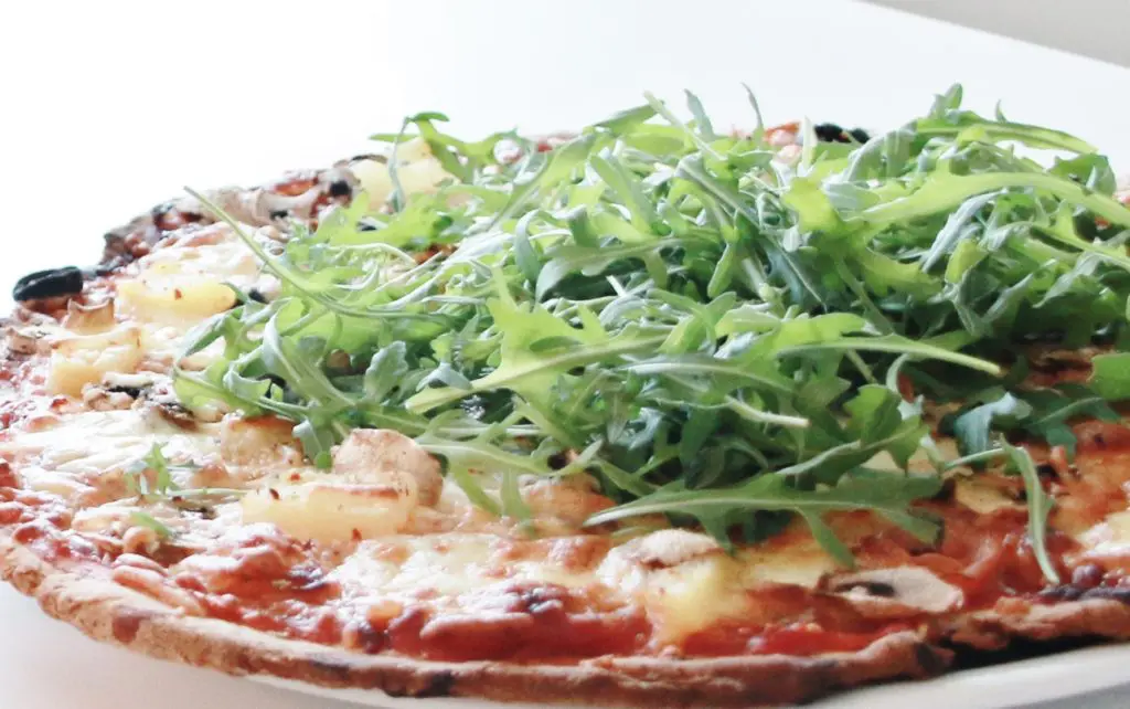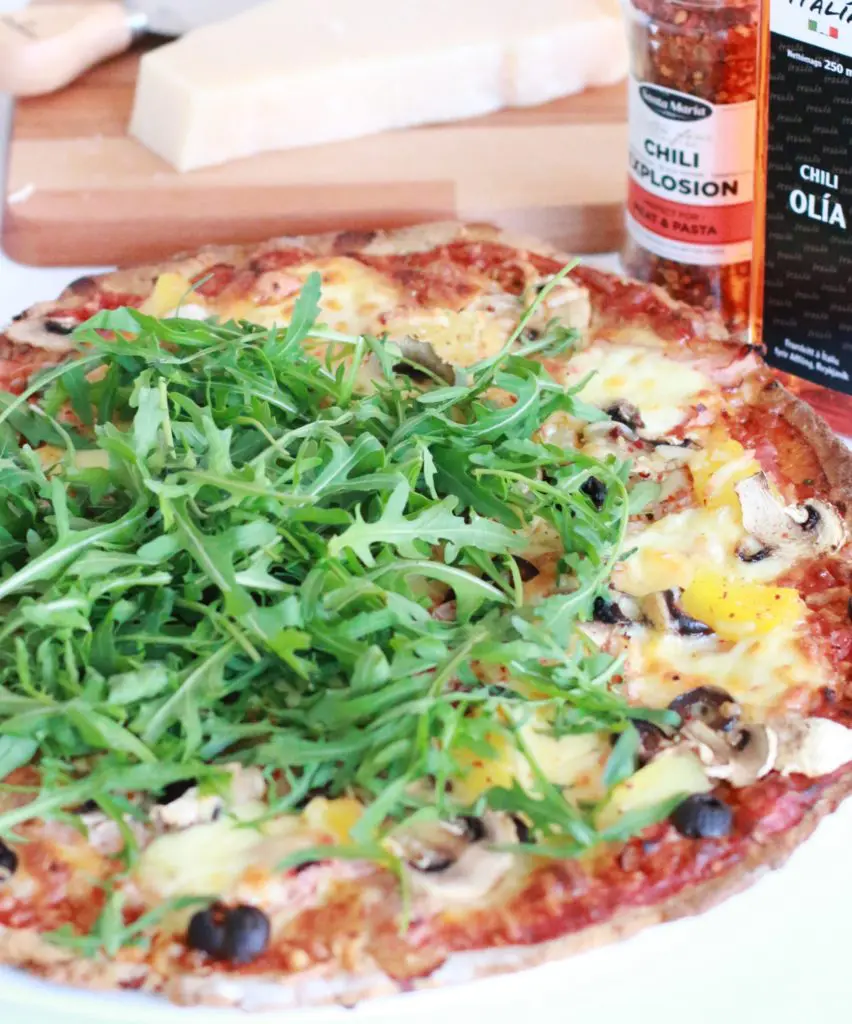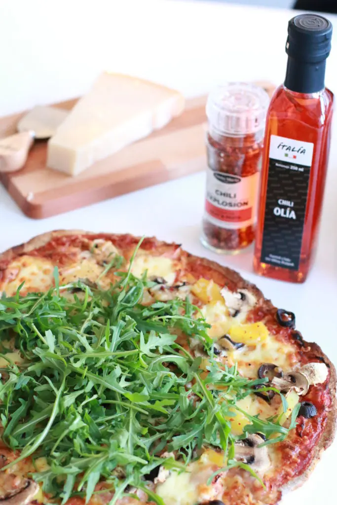 - Að lokum þegar pizzan er komin á diskinn, toppa ég hana með Chili olíu, chili explosion kryddi, klettasalati og parmesan osti.