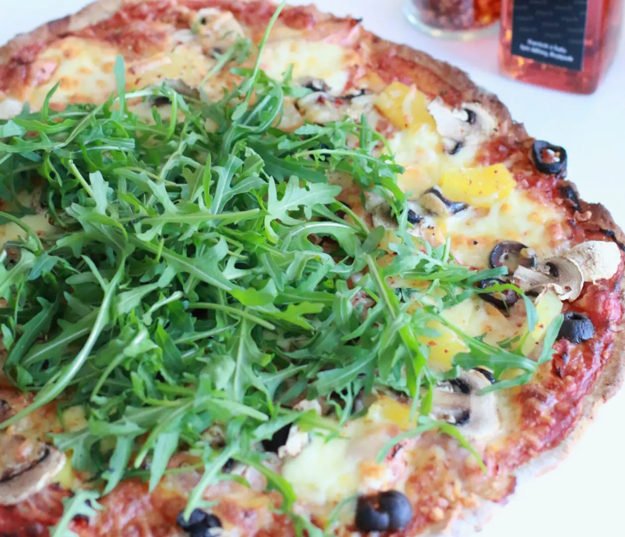 - Að lokum þegar pizzan er komin á diskinn, toppa ég hana með Chili olíu, chili explosion kryddi, klettasalati og parmesan osti.