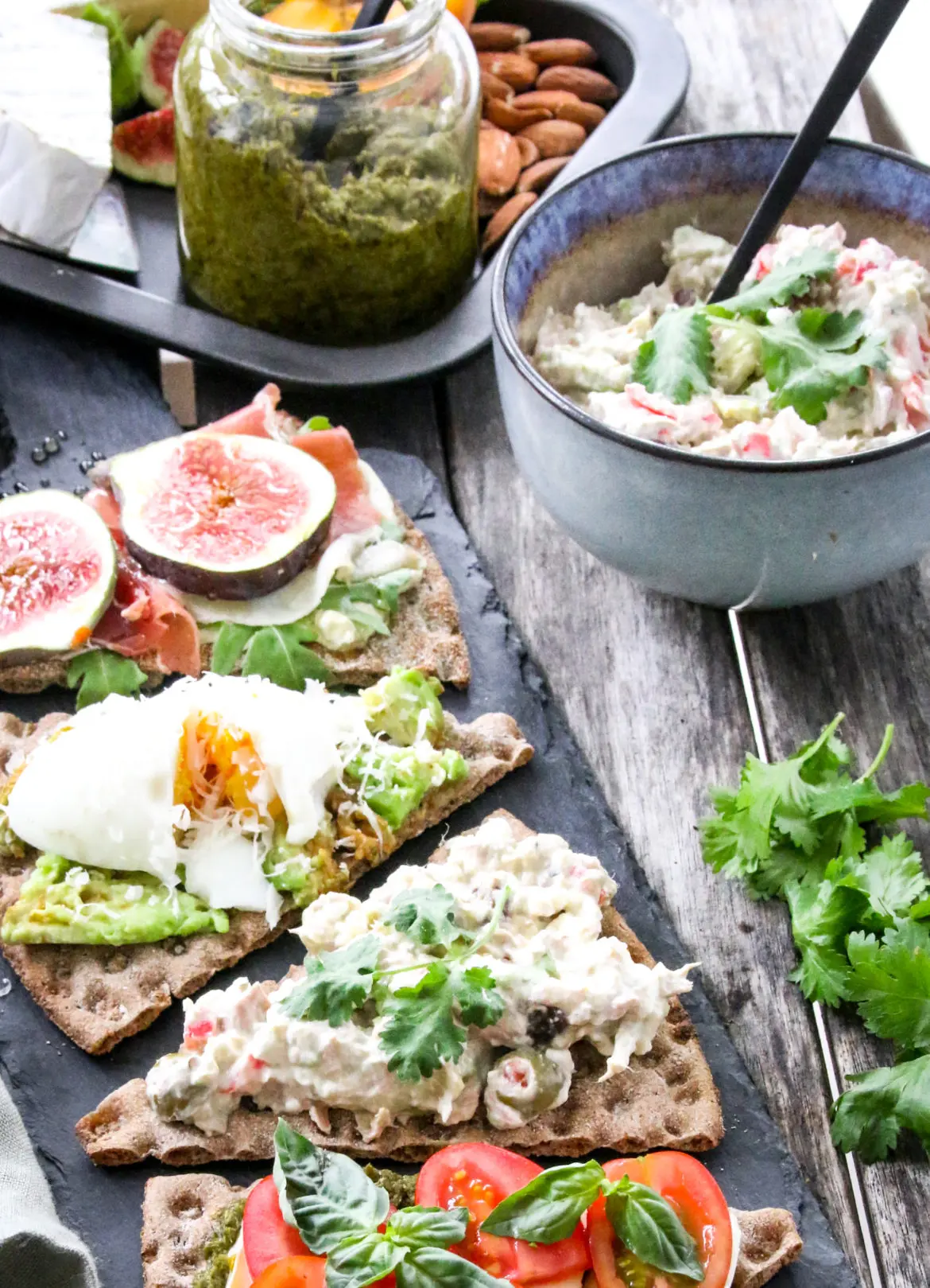 Ég mæli með að borða salatið ofan á góða súrdeigsbrauðsnei, hrökkkexi eða góðu kexi eins og er notað með ostum eins og ýmiskonar saltkexi. Alls ekki vera hrædd við að nota döðlurnar því þær gera salatið rosa gott og eru gott mótvægi við saltar ólvurnar. Passið bara að skera þær mjög smátt.