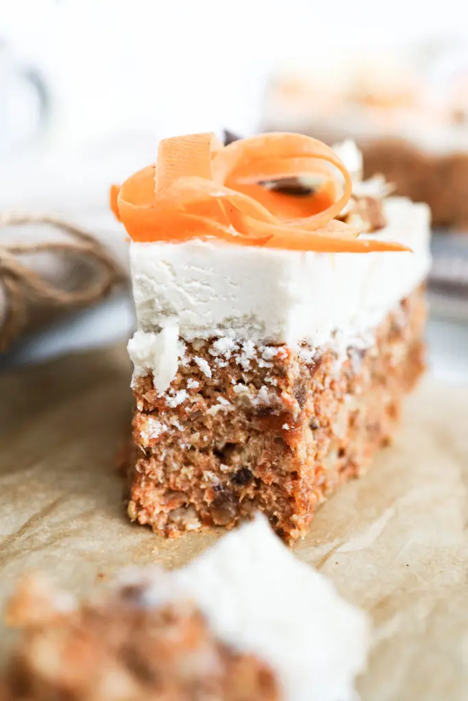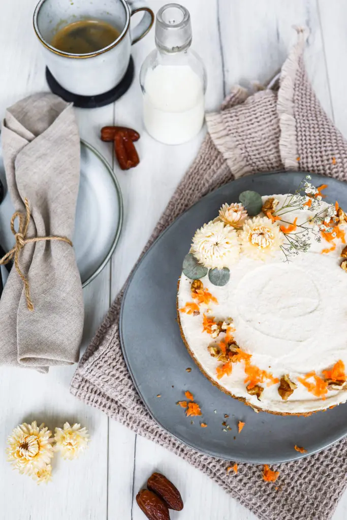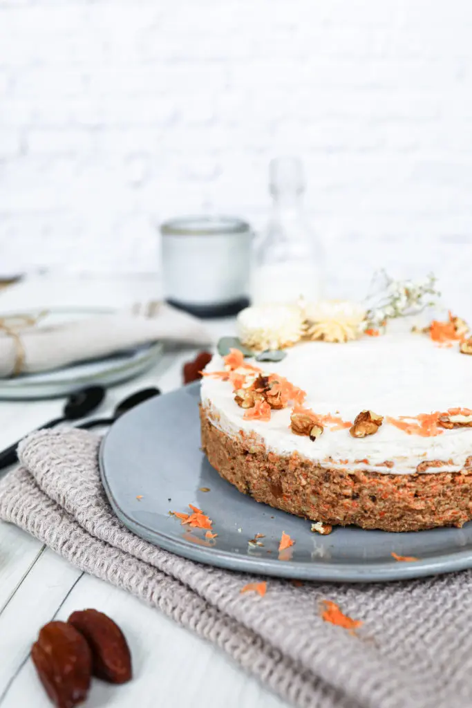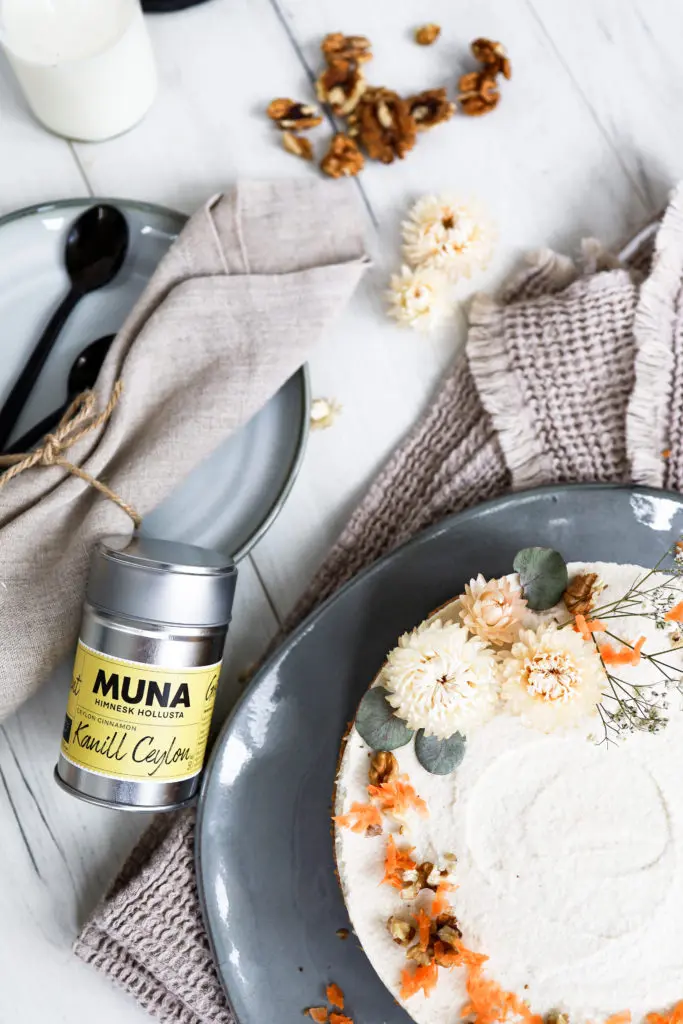 Gulrótarterta með kasjúhneturkremi !! Hér eru engar dýraafurðir og því er hún líka vegan, mjólkur og eggjalaus.