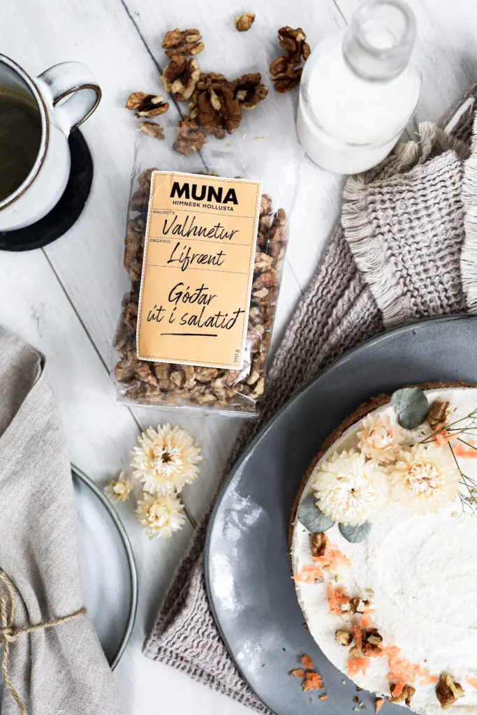 - Takið svo kökuna úr frystir 1 klst áður en á að borða hana og skreytið hana ef þið viljið með hnetum og gulrótum og blómum þess vegna.