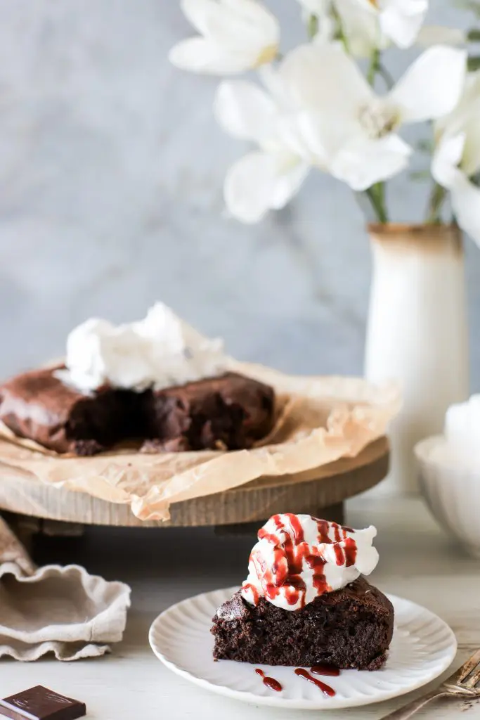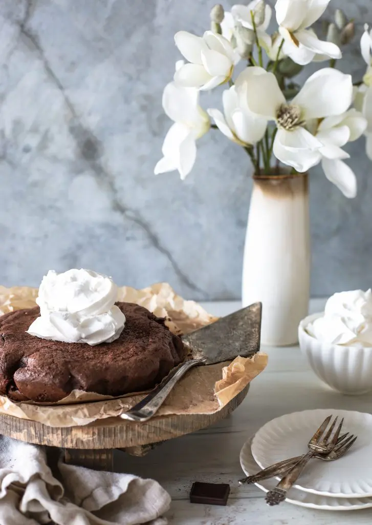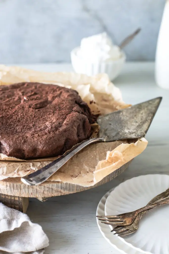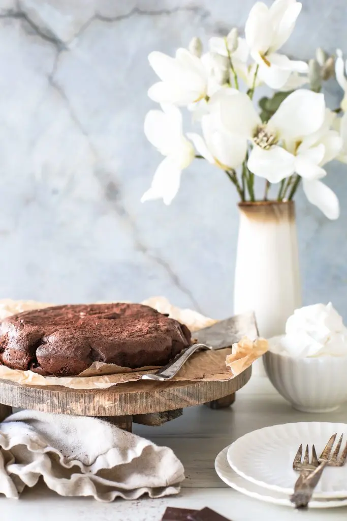 Hér er ég með eina dásamlega góða köku sem er í senn einföld en afar ljúffeng, svona kaka kallast oft torte á ensku en þá er verið að vísa til fallinnar súkkulaðiköku.