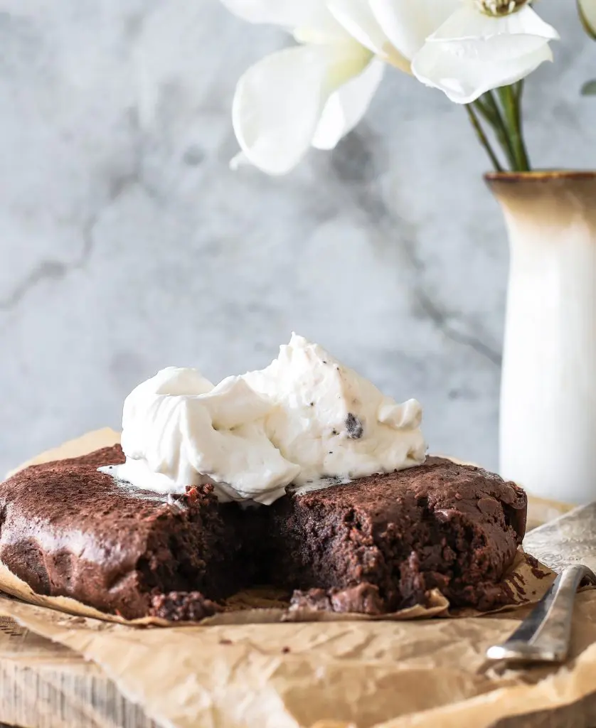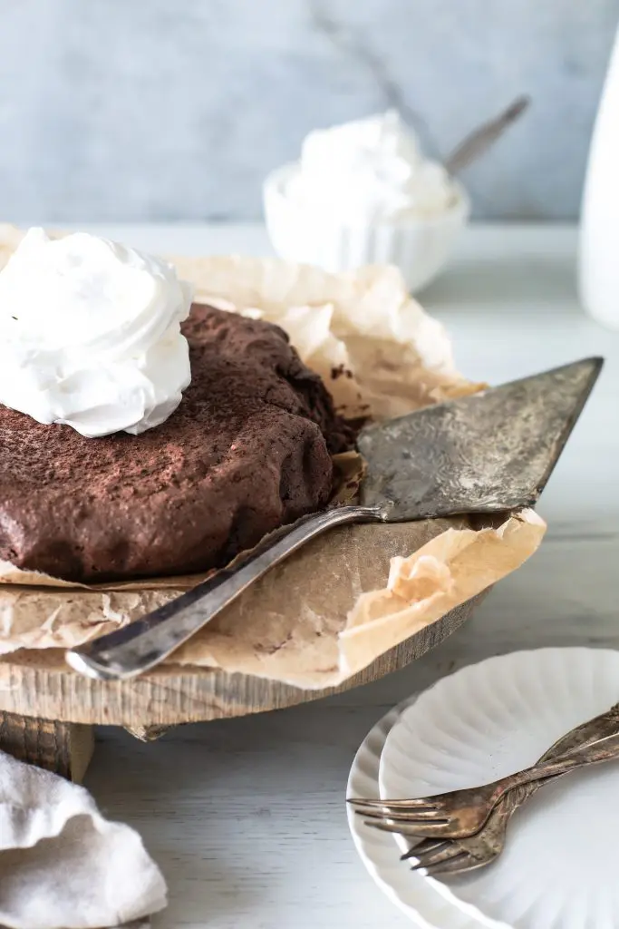 Ef ég ætti að líkja henni við einhverja sérstaka köku þá held ég að þessi sé mjög skyld franskri súkkulaðiköku, nema þessi er hveitilaus og eins og með þá frönsku er hún best með rjóma.