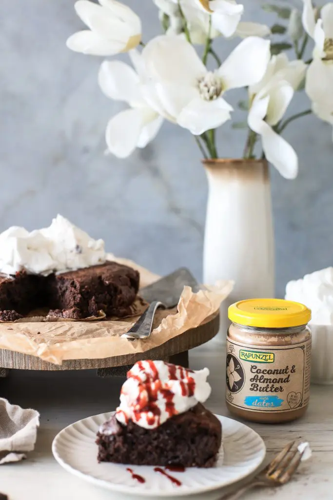- Sigtið smá kakó yfir kökuna heita og berið fram með rjóma (ég notaði þeytirjómann frá Oatly) og döðlusíróp frá Rapunze yfir kökuna sem er geggjað gott með !!