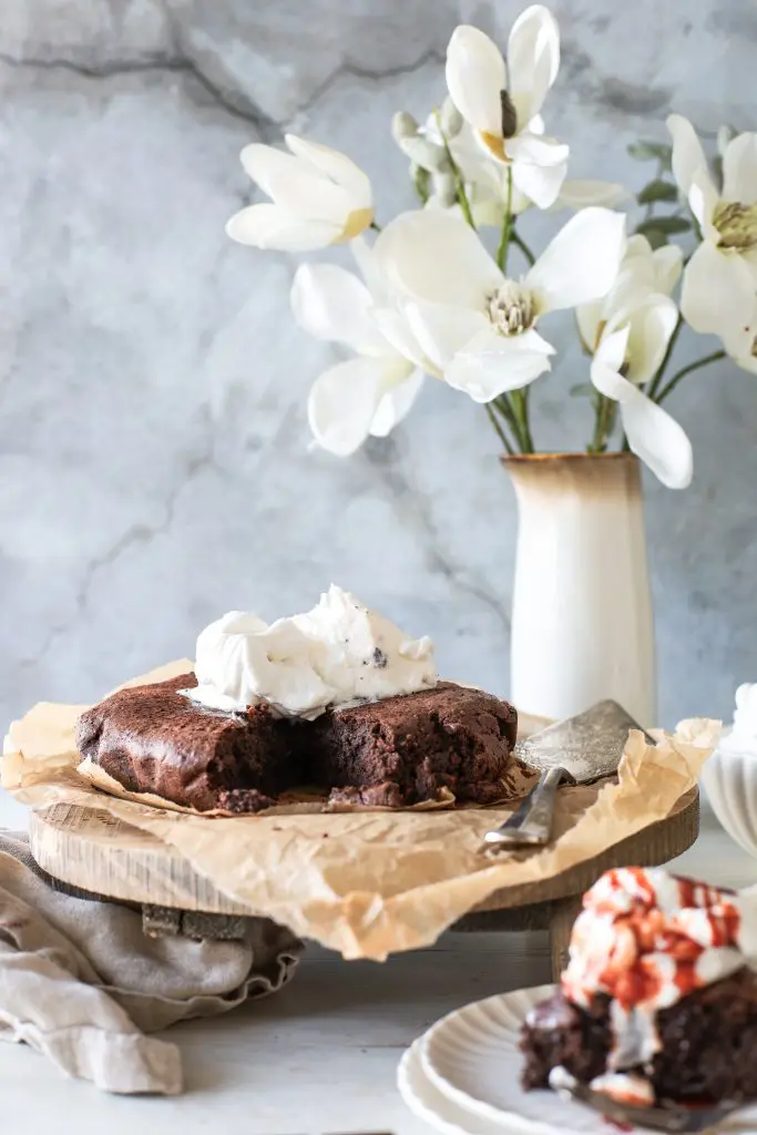 Kakan er best borin fram heit en hún er í senn stökk að utan og blaut og klístruð að innan eins og blanda af franskri súkkulaðiköku og kladdaköku.