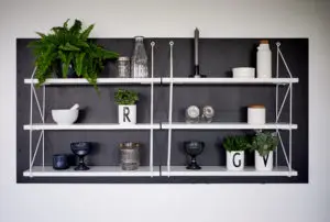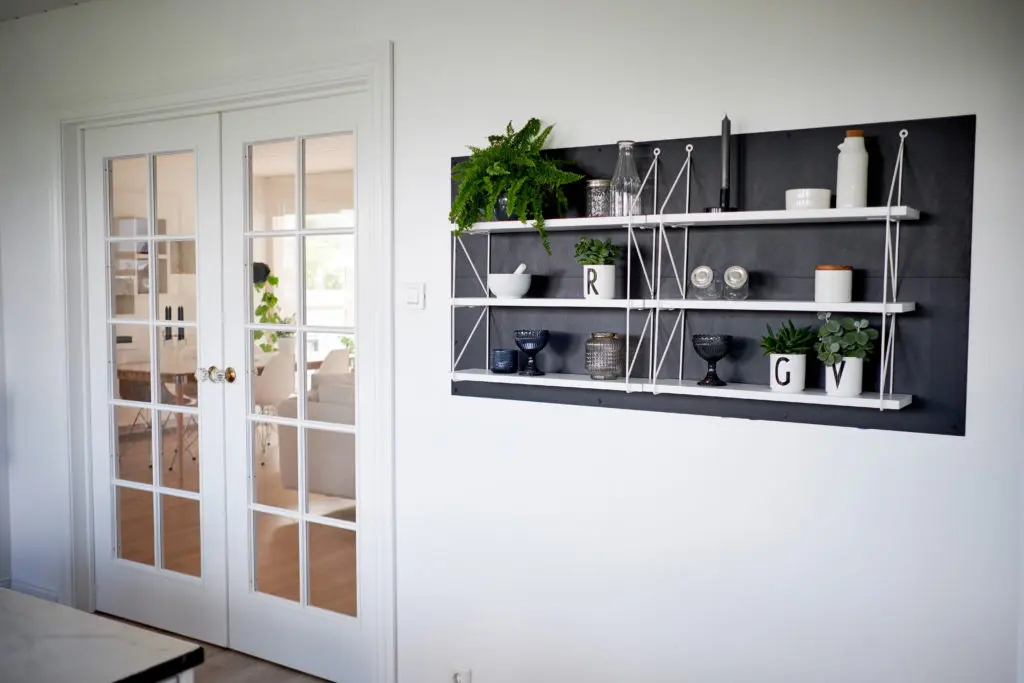 Hér var stór eining og var mikið af götum og sárum eftir hana á veggnum ásamt fullt af rafmagnsdósum. Við settum upp þessar hillur til að fela sárin. Ef ykkur langar að lesa allt sem við gerðum við eldhúsið ásamt kostnaðinum við það er færsla um það hér