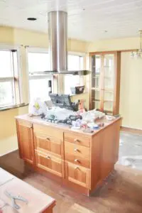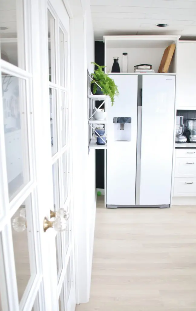 Við notuðum svo gamlar plötur sem voru í innréttingunni og smíðuðum skáp úr þeim utan um ísskápinn og lökkuðum á sama máta og áður