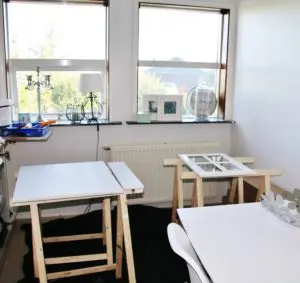 - Fullt af málningarfötum, dósum, skálum eða öðru til að láta frontana þorna á