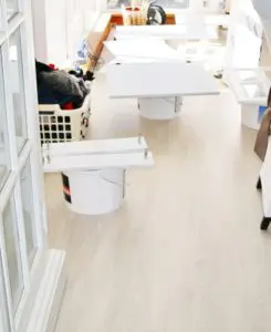 Hér sést í raufirnar en þær þurfti að pensla í áður en byrjað var að rúlla yfir. Svo þarf að passa að láta allt þorna á fötum, skálum eða ílátum sem ná aðeins frá gólfi
