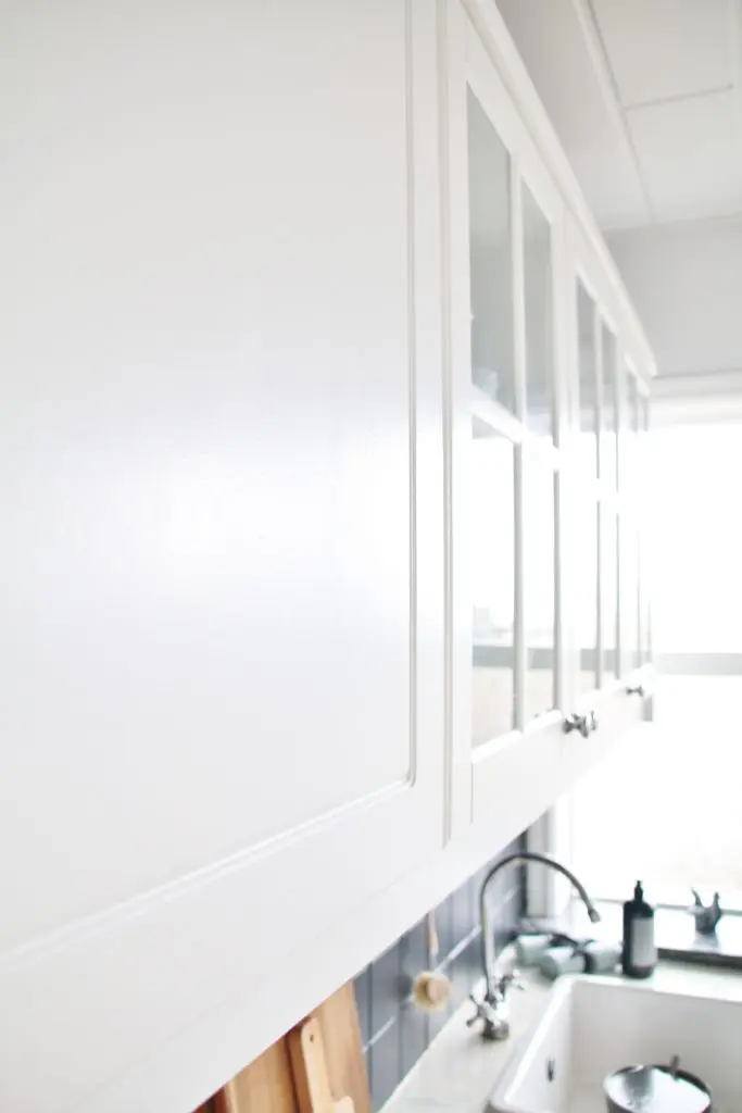 Skáparnir mínir voru mjög ljótir inn í en þeir voru gráir. Þar sem ég hafði keypt 3 glerhurðir til að brjóta upp innréttinguna fannst mér svo ljótt að sjá grátt inn í skápnum að ég málaði hann hvítan að innan. Annars þarf þess ekki ef um lokaða skápa er að ræða.
