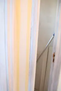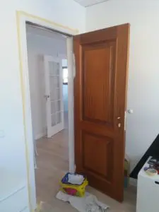 Svo þarf að að teipa allt sem á ekki að lakka eins og lás og veggi en við t.d. máluðum lamirnar líka hvítar og kom það afar vel út. Svo þarf að taka hurðarhúna af hurðunum.