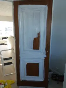 Það sem er mjög mikilvægt að gera er að byrja á að pússa hurðir og karma ef þess þarf. Ef það er mikið lakk eða glans á hurðum þá verðið þið að pússa létt yfir til að rispa yfirborðið svo það náist grip fyrir grunninn. Ég er ekki að tala um að þið eigið að ná öllu lakki af og pússa niður í viðinn. Alls ekki gera það ! Það þarf í raun bara að rispa yfirborðið og ekkert meira en það. Við slepptum því reyndar að pússa hjá okkur hurðirnar því viðurinn var orðin mjög matttur og opinn og því fannst okkur það vera óþarfi.
