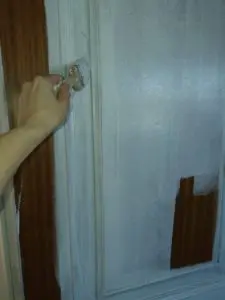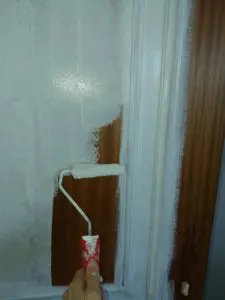 Þegar búið er að grunna karmana byrjar maður á hurðunum. Fyrst málaði ég með pensli inn í alls staðar þar sem rúlla kemst ekki fyrir. Svo notaði ég rúllu á alla slétta fleti. Þegar maður er að grunna þarf ekkert að hafa miklar áhyggjur af útkomunni sem slíkri, bara passa að þekja vel allt saman og að það séu ekki svona dropar að leka.