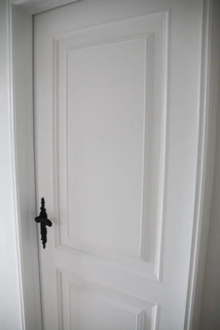 Hér sjást engar skuggalínur lengur á listum eða römmum og áferðin á hurðunum er mjög jöfn og slétt. Mér finnst þær alveg eins geta verið sprautaðar