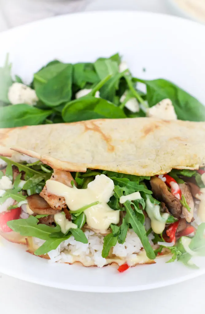 Kjúklingur, steiktir sveppir, grjón, ferskt grænmeti og dýrðar sinnepssósa sem toppar þetta svo allt saman……namm ég lofa að þetta er afskaplega gott og ekki erfitt að gera.