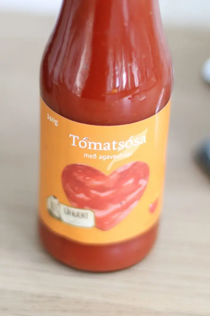 - 1 flaska Himnesk tómatsósa (sjá mynd neðar ekki nota aðra sósu en þessa en hún fæst í Bónus, passið að það sé tómatsósa ekki tómatpassata eða annað )