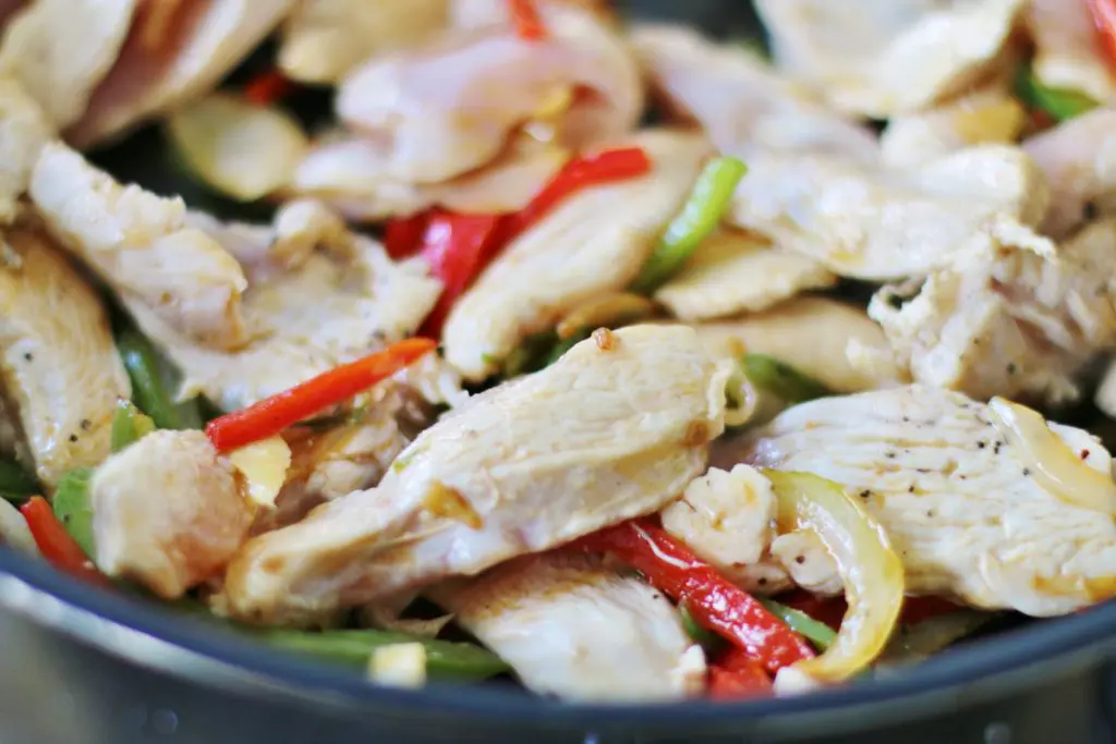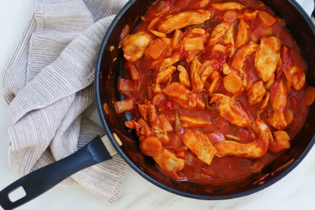 - þegar bringurnar eru orðnar hvítar að lit er tímabært að setja alla flöskuna af tómatsósunni út á. Það á ekki að steikja bringurnar alveg í gegn