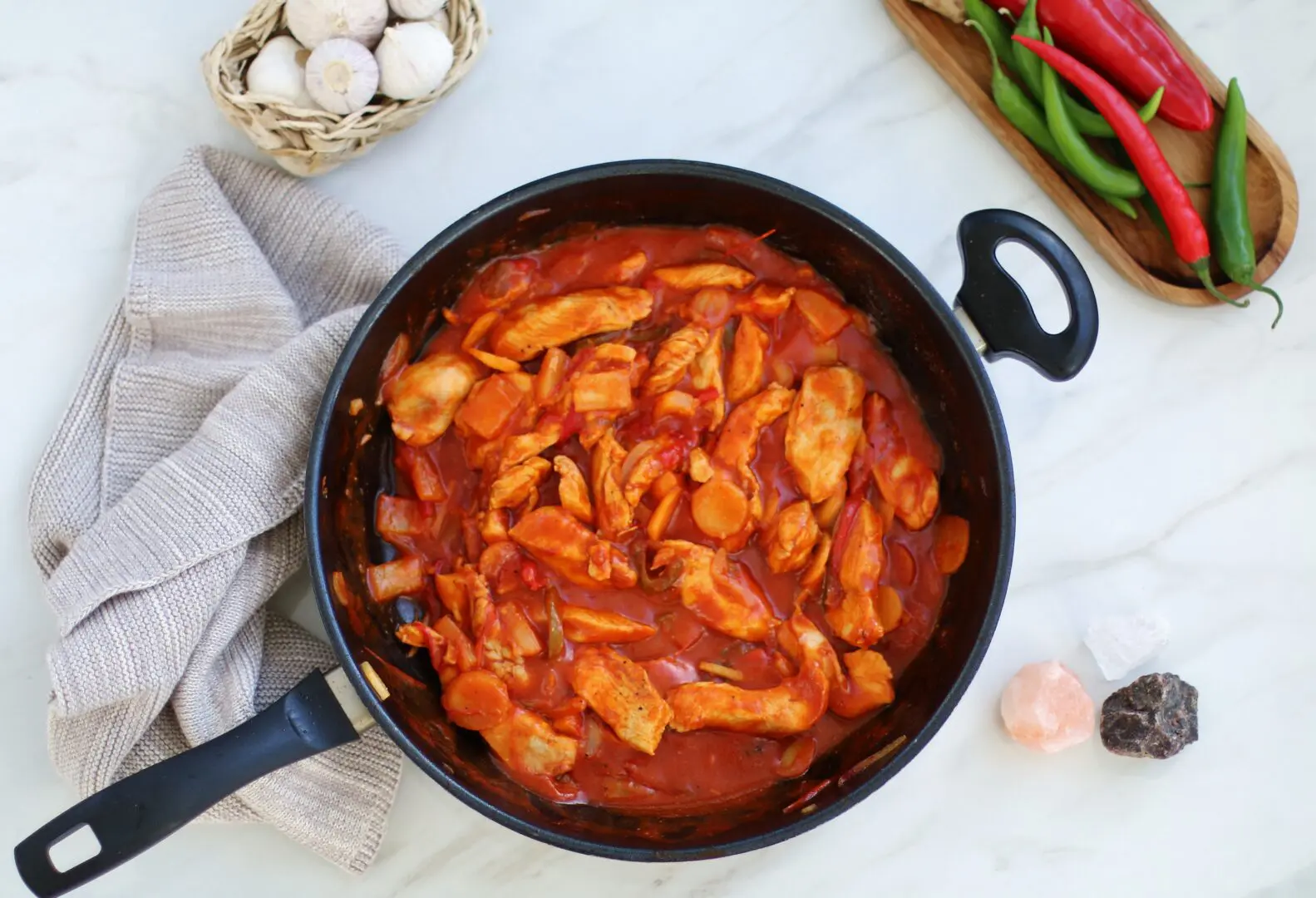 - þegar bringurnar eru orðnar hvítar að lit er tímabært að setja alla flöskuna af tómatsósunni út á. Það á ekki að steikja bringurnar alveg í gegn
