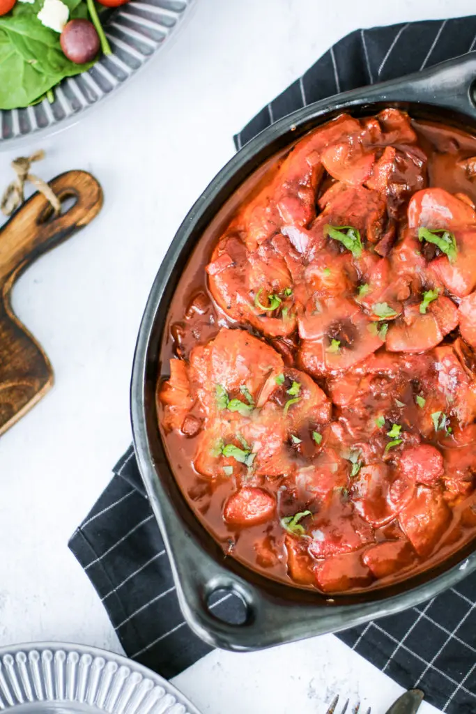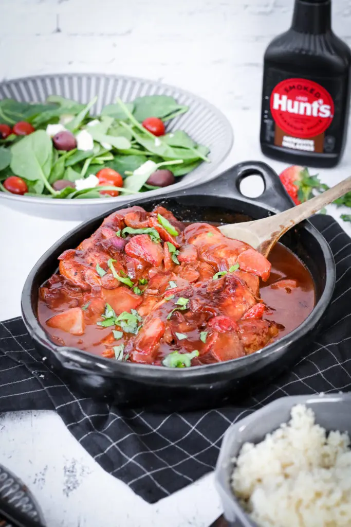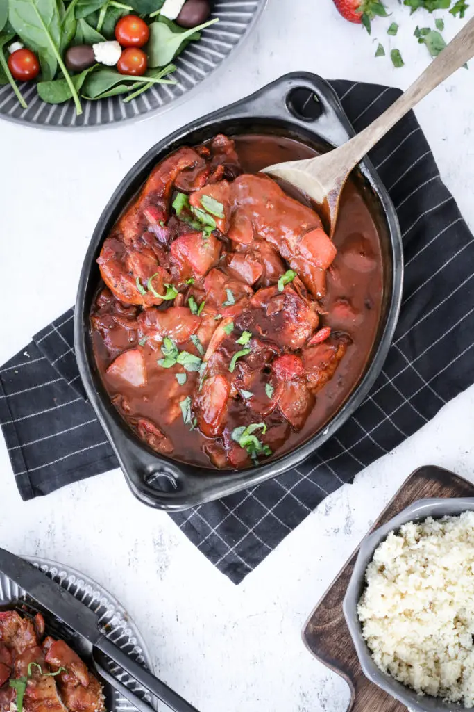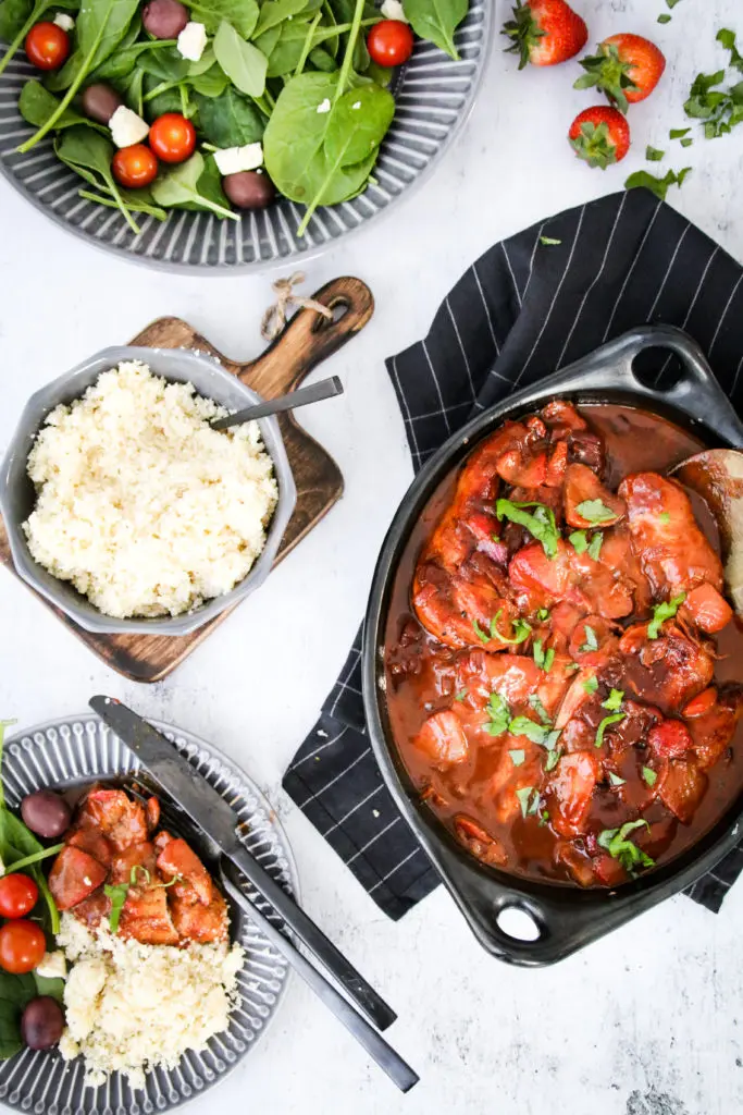 Kjúklingurinn verður ótrúlega meir og góður í sósunni en réttinn er gott að bera fram með kartöflumús eða frönskum eða cous cous og fersku salati með fetaosti og svörtum ólífum.