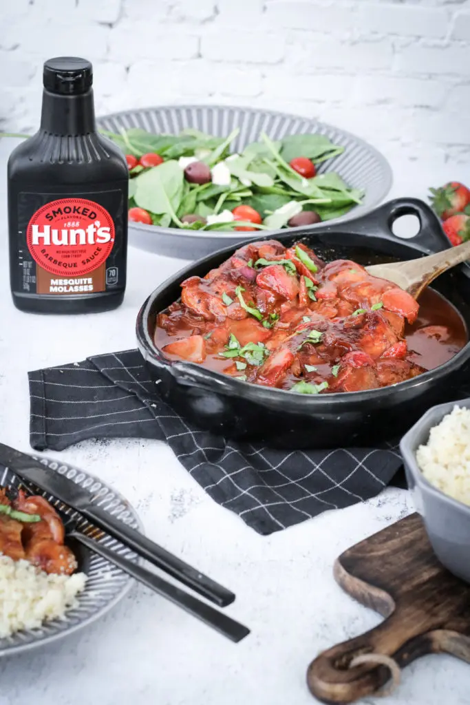 Ég notaði BBQ sósu frá Hunts en þær eru komnar í nýjan búning og til í mörgum bragðtegundum. Í þennan rétt notaði ég með Mesquite Molasses.