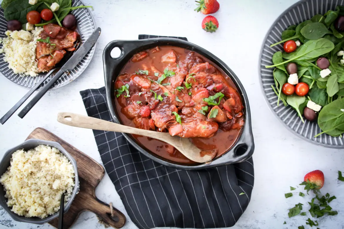 Kjúklingurinn verður ótrúlega meir og góður í sósunni en réttinn er gott að bera fram með kartöflumús eða frönskum eða cous cous og fersku salati með fetaosti og svörtum ólífum.