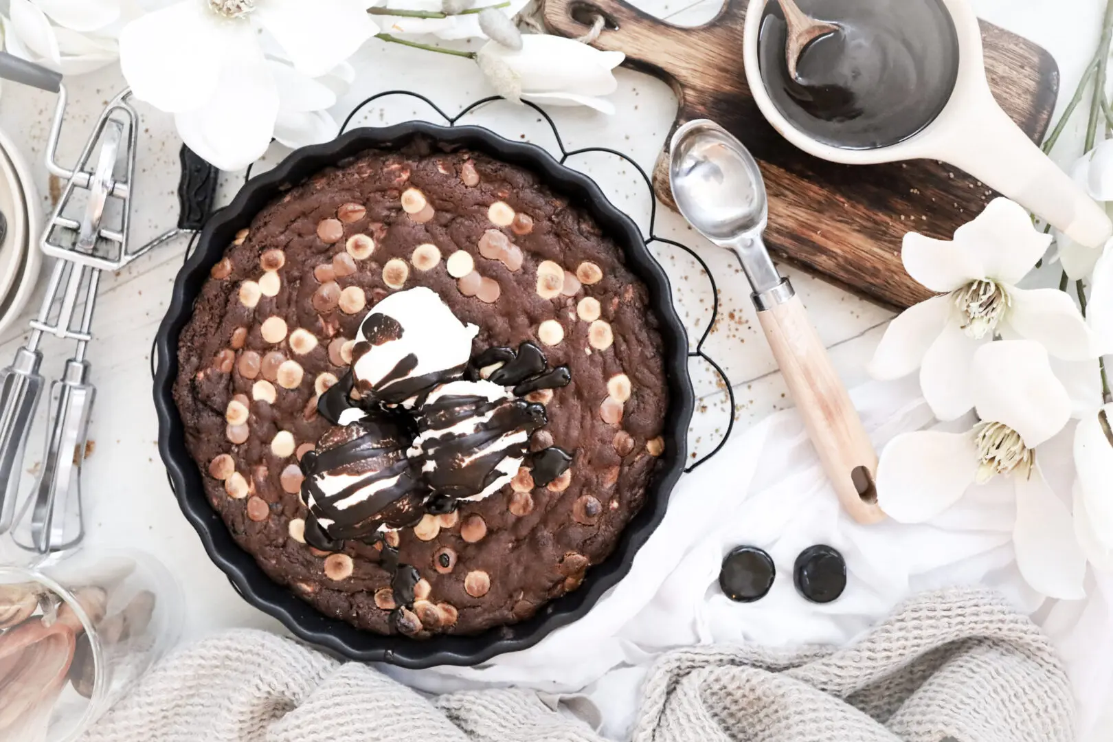 - Best er að bera kökuna fram heita beint úr ofninum með ísnum og heitri sósu