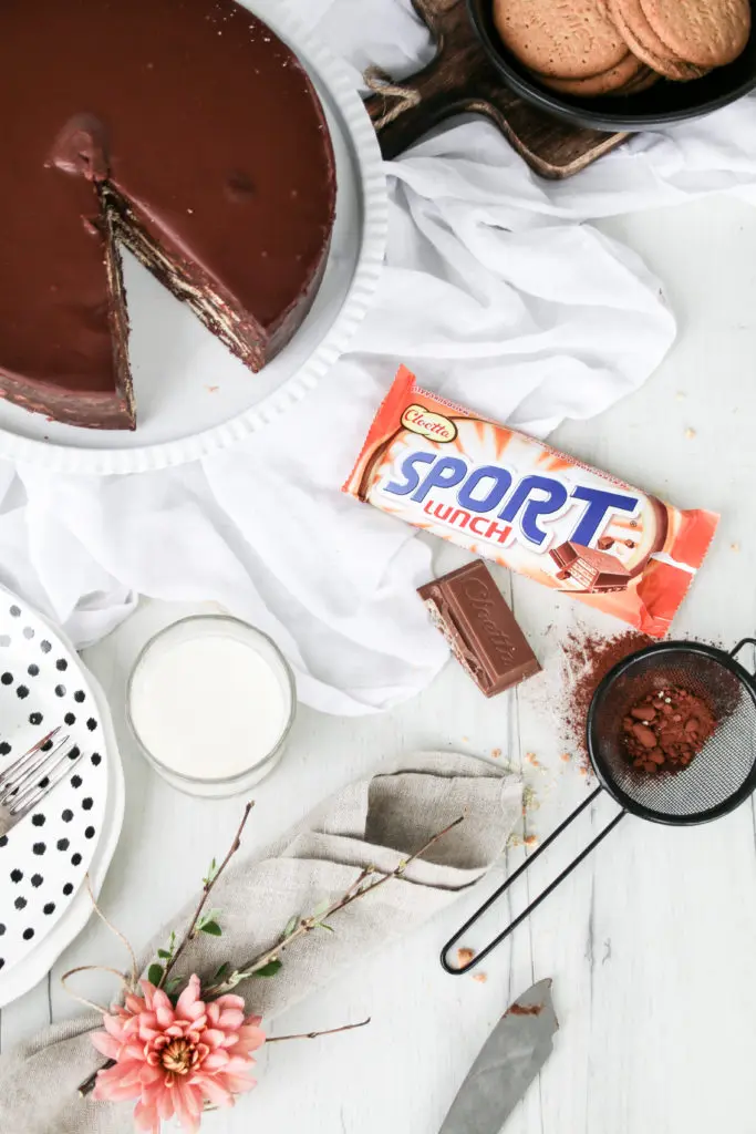 Þið skulið ekki hræðast að gera þessa köku en hún er alveg fáranlega létt og svooo þess virði að gera. Hún er stútfúll af dásamlegum sport Lunch stykkjum, svo sem betur fer eru þau á afar góðu verði eða á rétt rúmar 150 kr í Bónus. Ég mæli líka með að þið notið akkurat þetta hafrakex sem ég nefni en það hentaði alveg fullkomlega fyrir þessa köku. Sniðugt er að gera þessa köku að kvöldi til, til að hafa daginn eftir en einnig má gera hana að morgni og láta þá standa í 6 tíma í kæli áður en hún er borin fram, en kökuna tekur enga stund að gera.