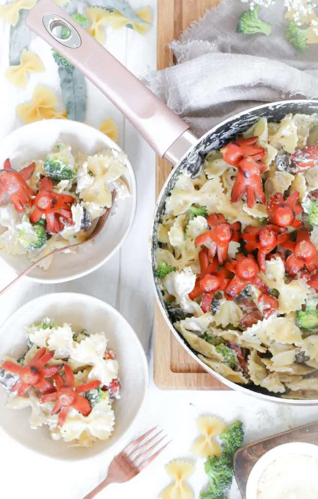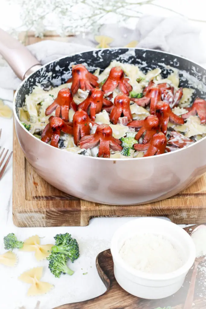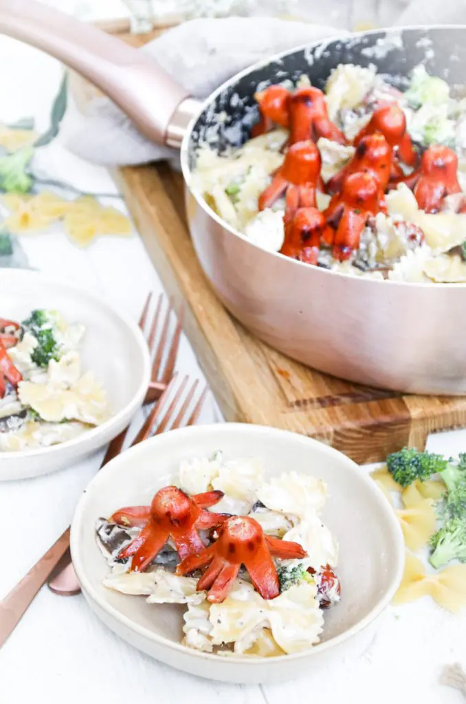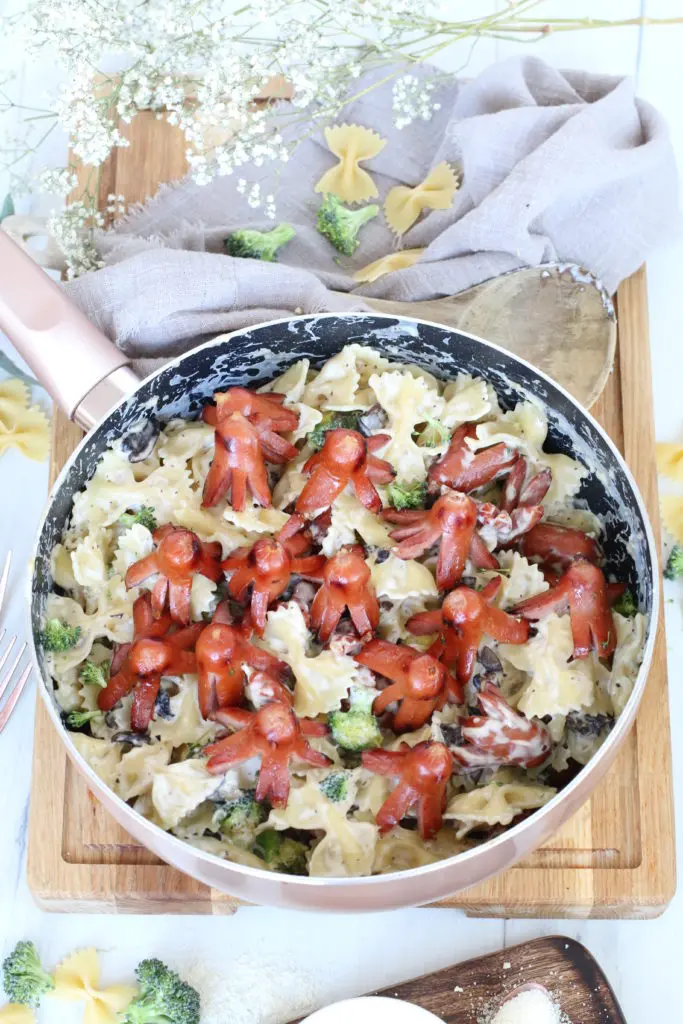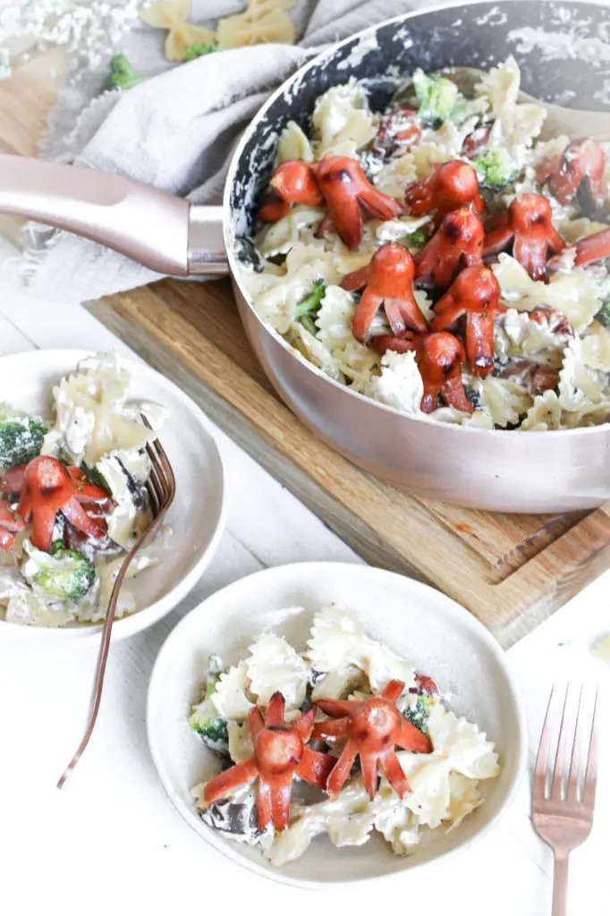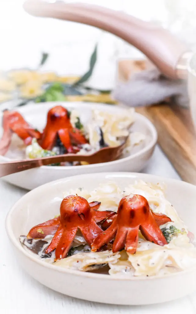 Krakkar elska oft pasta, og ég tala nú ekki um ef það eru pylsur með, en mín börn elska pylsur. Hér ákvað ég að gera réttinn skemmtilegan fyrir krakkana með því að skera pylsurnar í kolkrabbalíki.