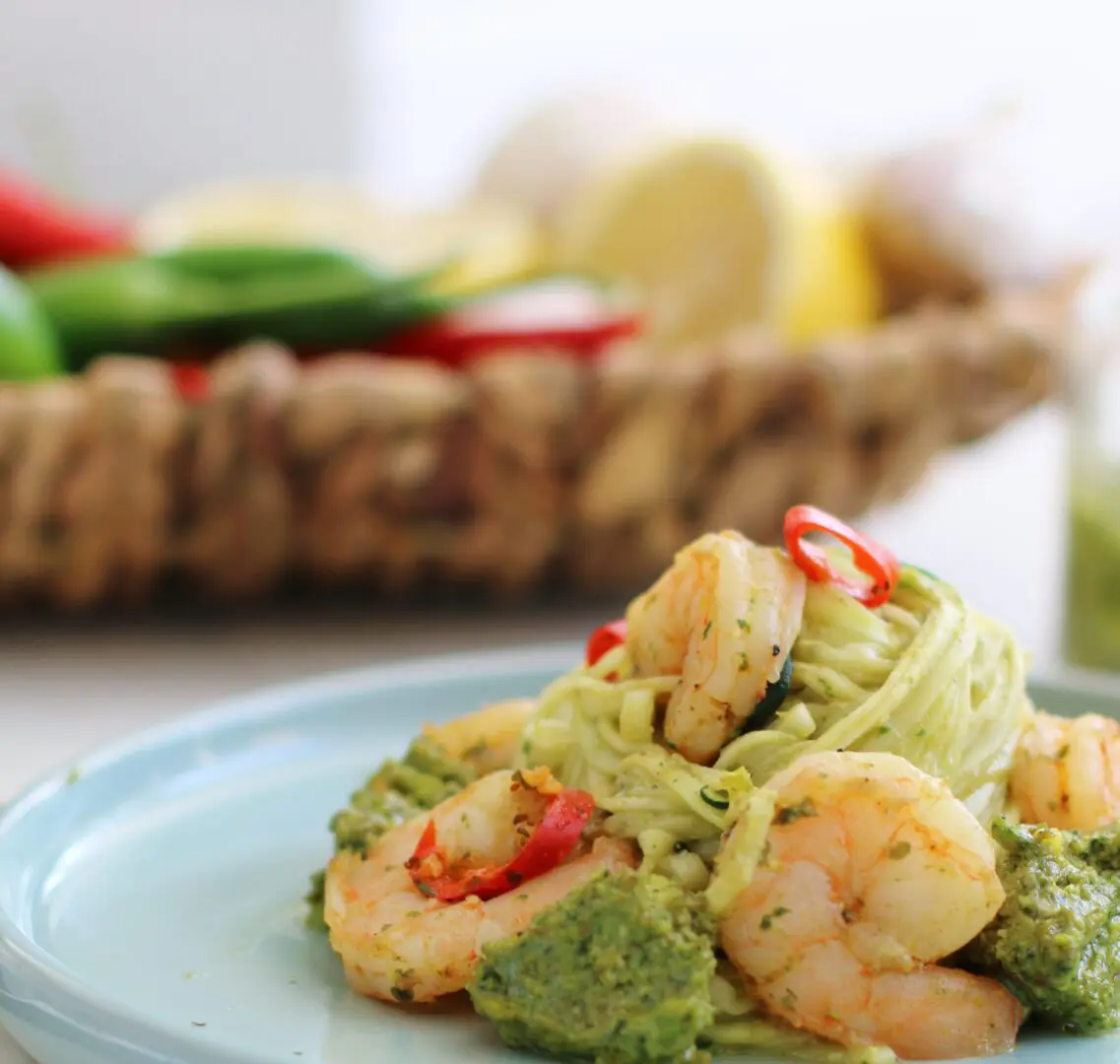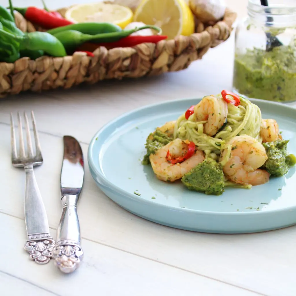 - Slökkvið undir og setjið núðlurnar út á rækjurnar í stóru skálinni, og bætið pestó við og hrærið vel saman