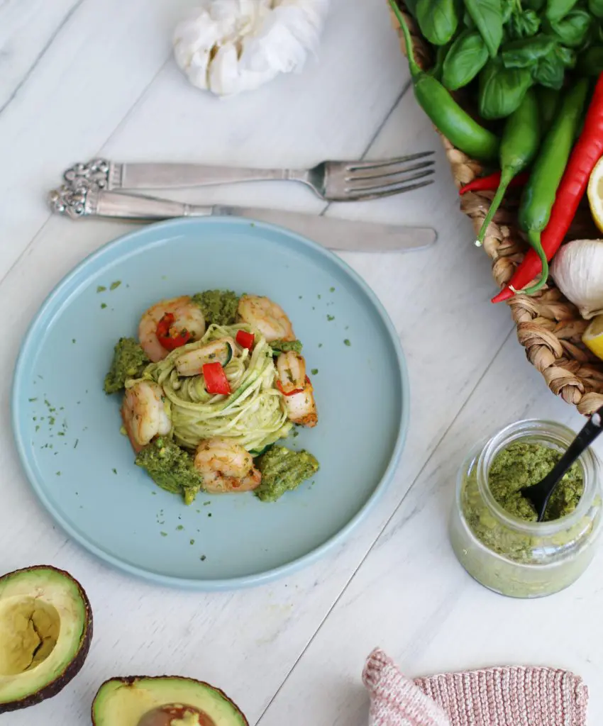 - Næst er að byrja á Pestóinu. Setjið avócado, basiliku, pistasíuhnetur, sítrónusafa, salt, pipar og olíu í blandara og mixið vel saman, þar til verður til fallega grænt pestó