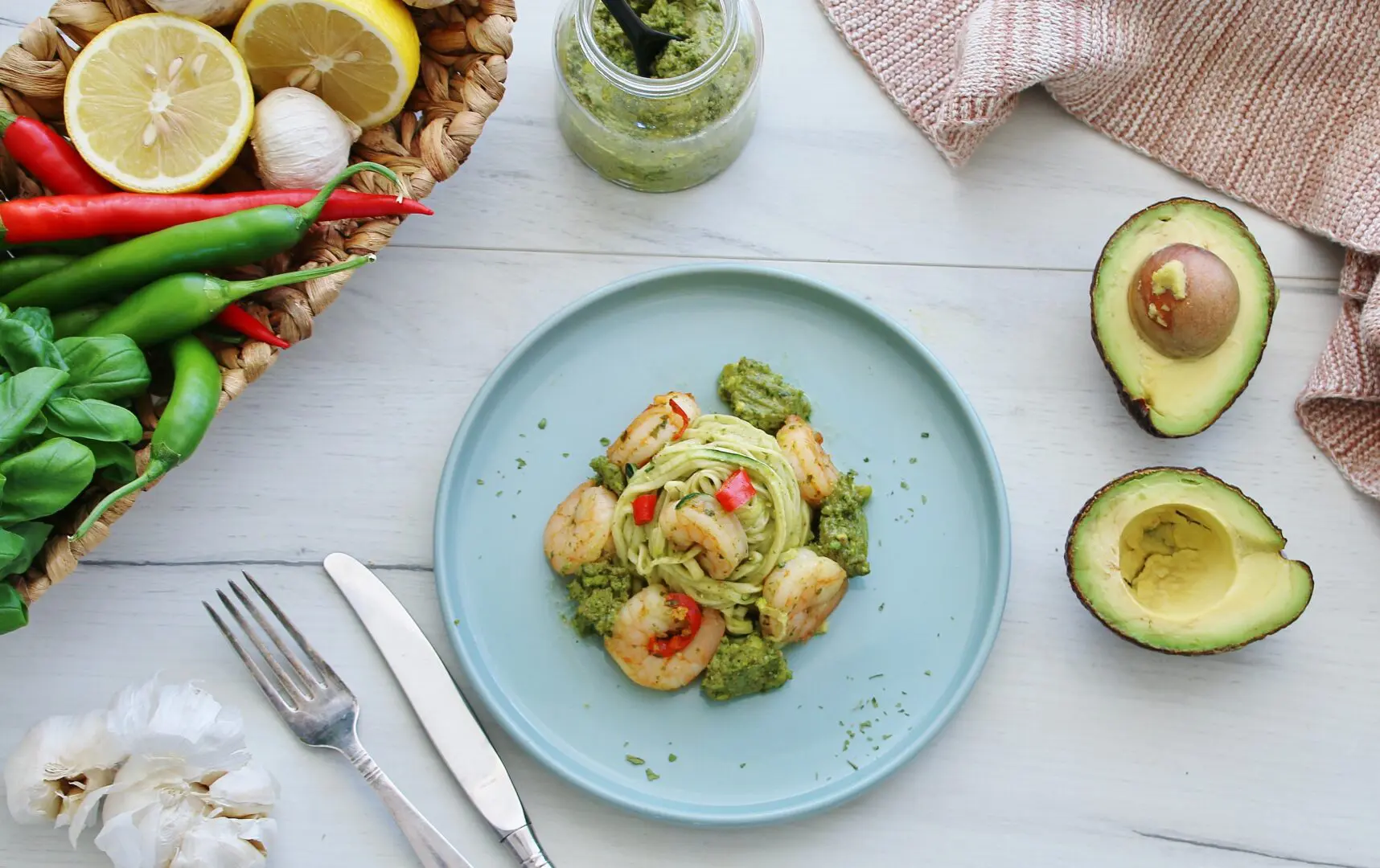 - Næst er að byrja á Pestóinu. Setjið avócado, basiliku, pistasíuhnetur, sítrónusafa, salt, pipar og olíu í blandara og mixið vel saman, þar til verður til fallega grænt pestó