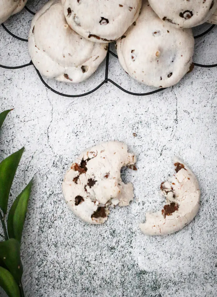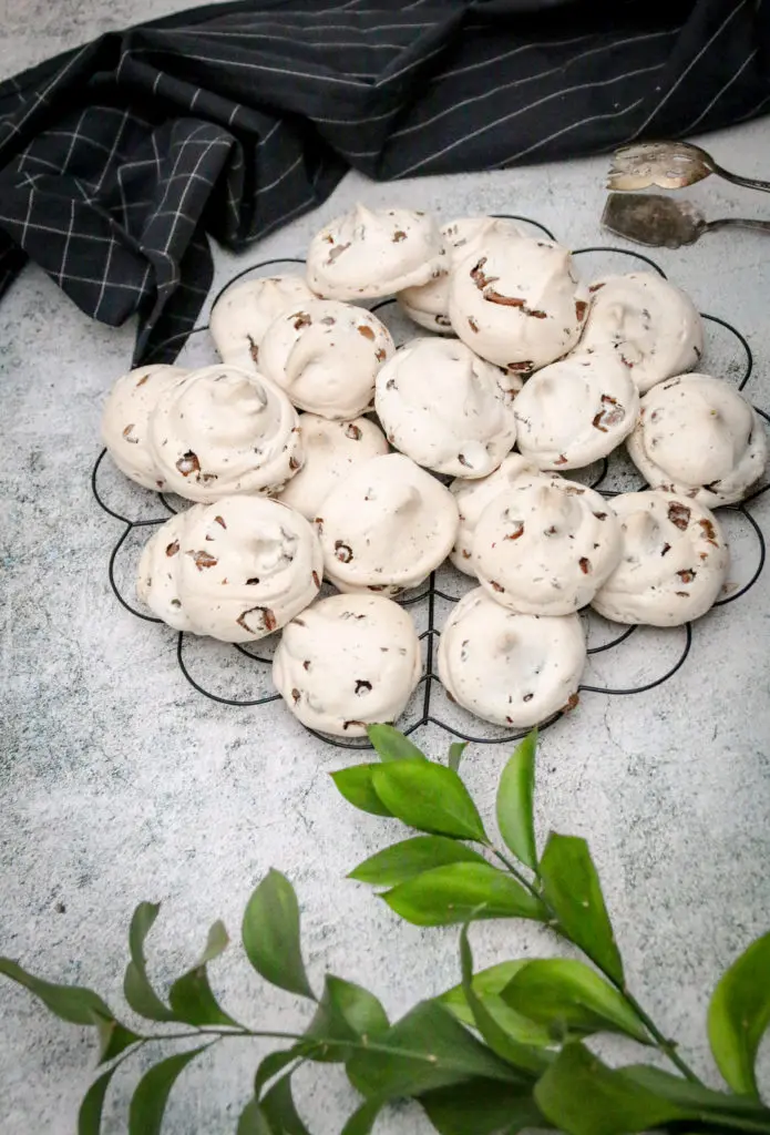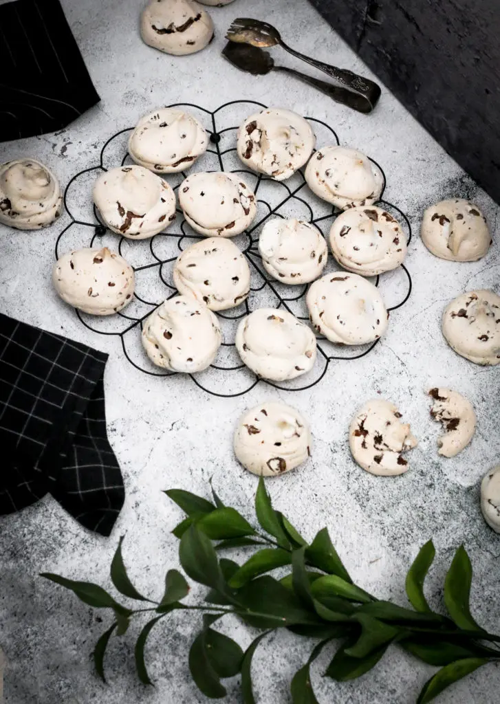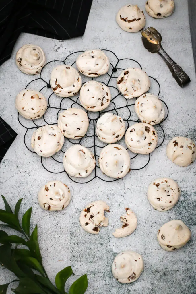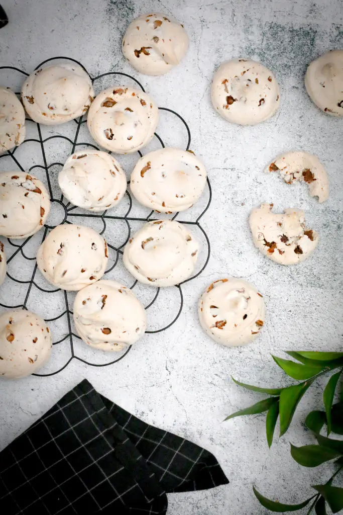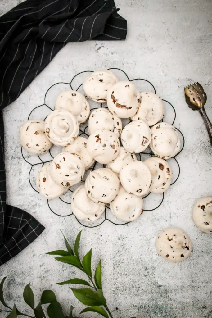 Leyfið toppunum að kólna ögn áður en þið takið þá af bökunarplötunni og færið þá yfir á annað fat. Ef þið reynið að taka þá of snemma þá munu þeir fara í klessu. Mikilvægt er að leyfa þeim að þorna og kólna upp á borði í eins og 15-20 mínútur. Best er svo að geyma toppana ekki í kæli heldur í krukku eða boxi upp á borði svo þeir haldist dúnamjúkir.