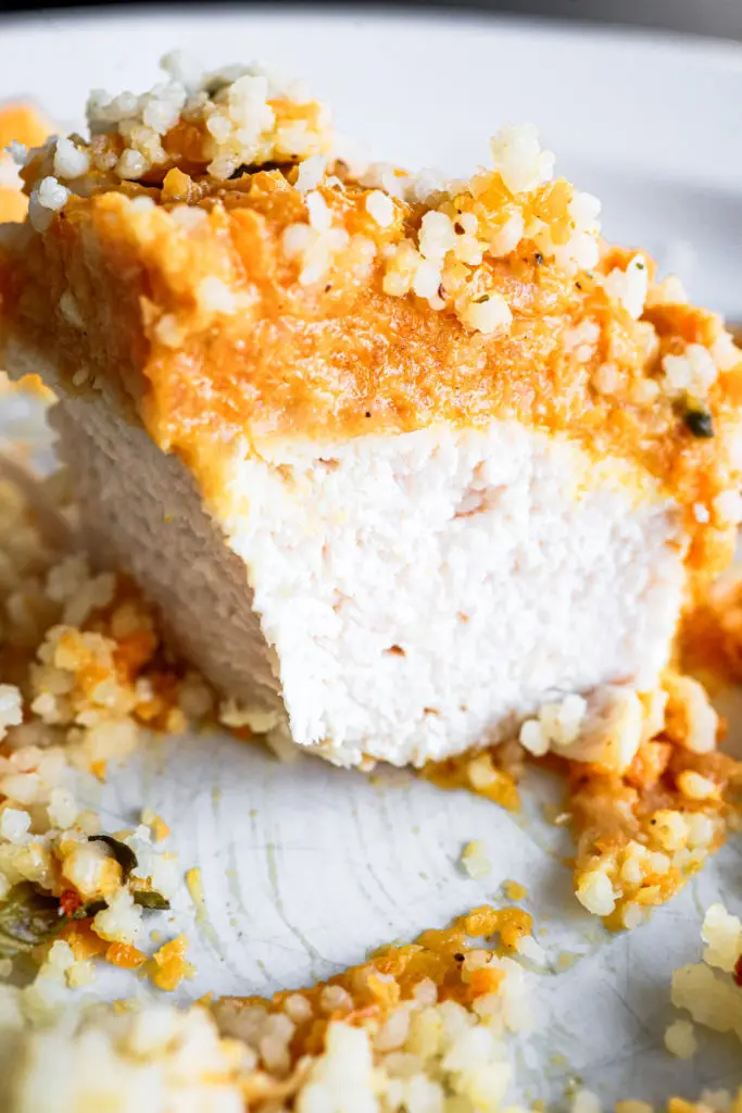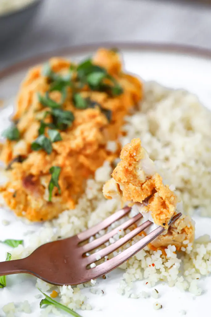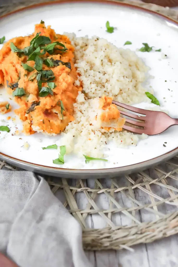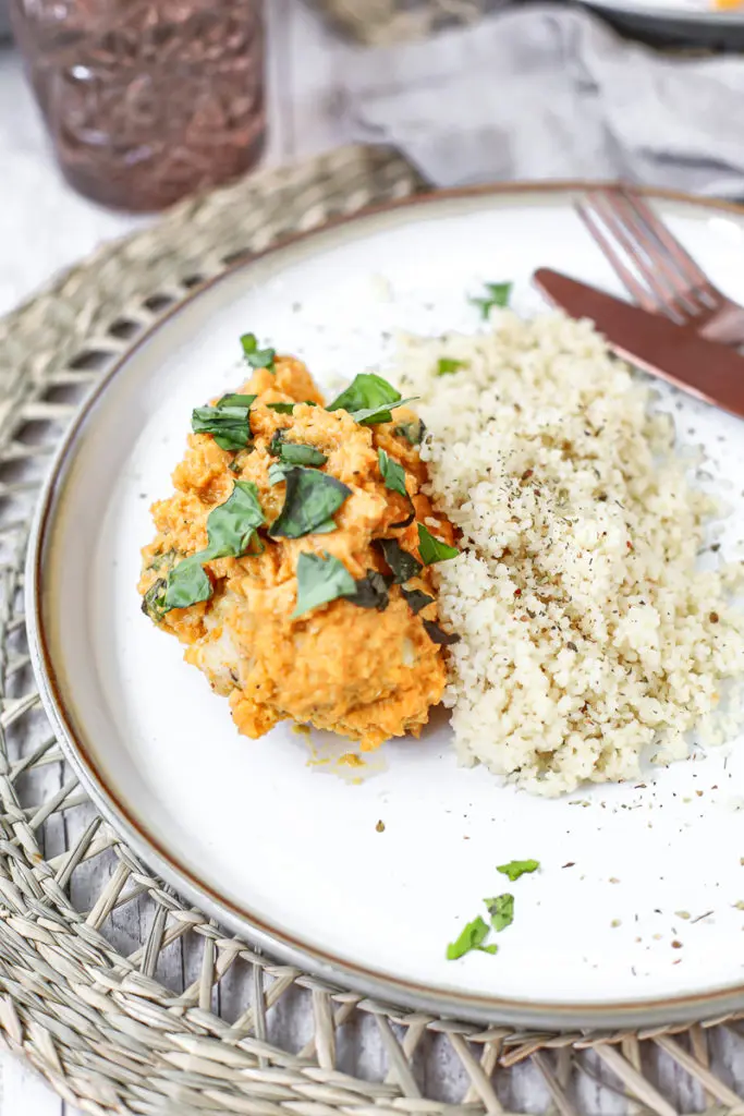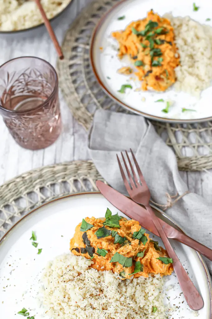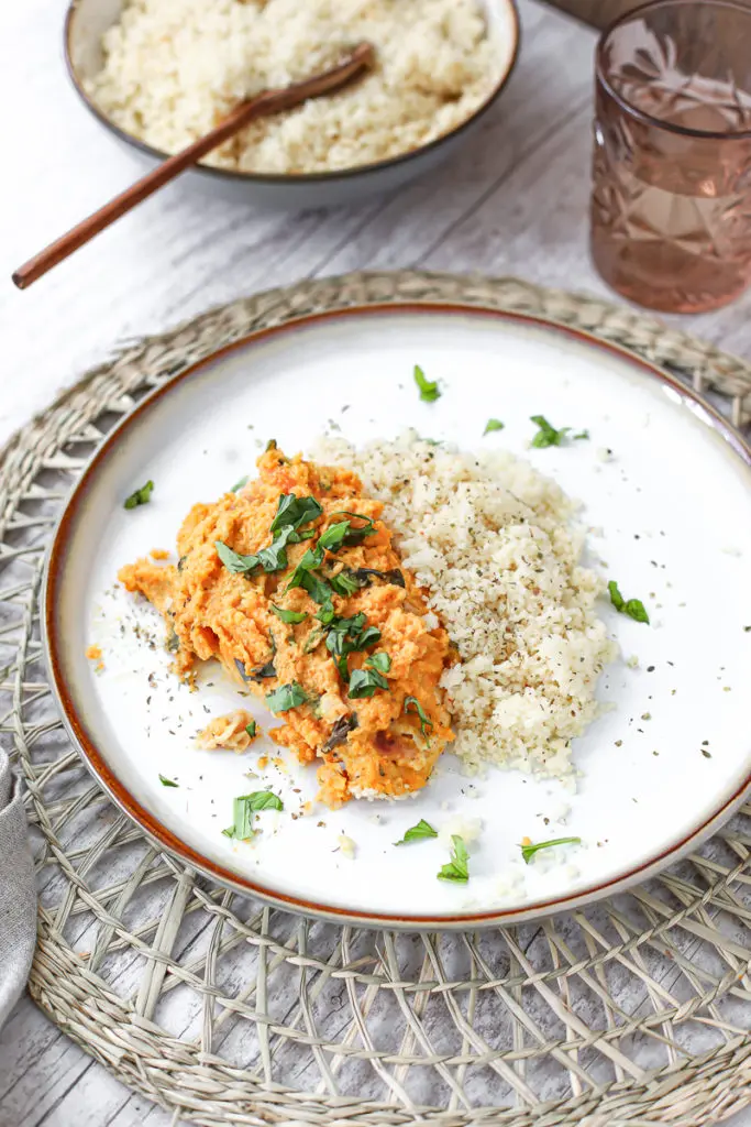Gulrótarsósan er bragðmikil og þétt í sér og hjúpar kjúklingin svo fallega og gefur réttinum afar ljúffenga áferð.