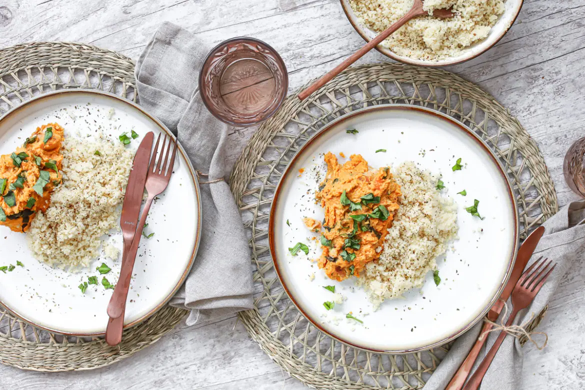 Gulrótarsósan er bragðmikil og þétt í sér og hjúpar kjúklingin svo fallega og gefur réttinum afar ljúffenga áferð.