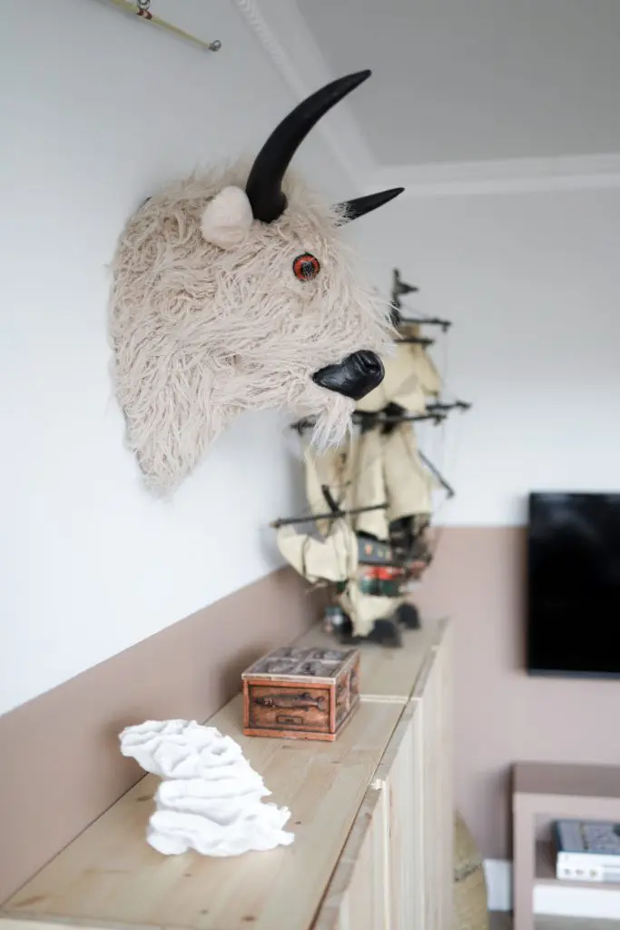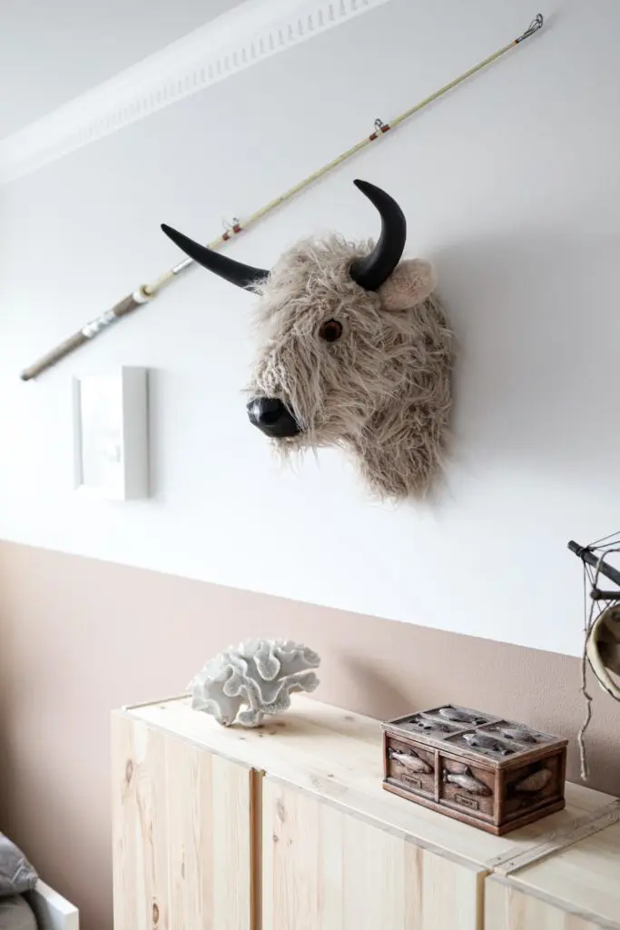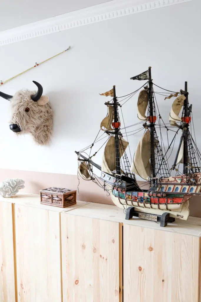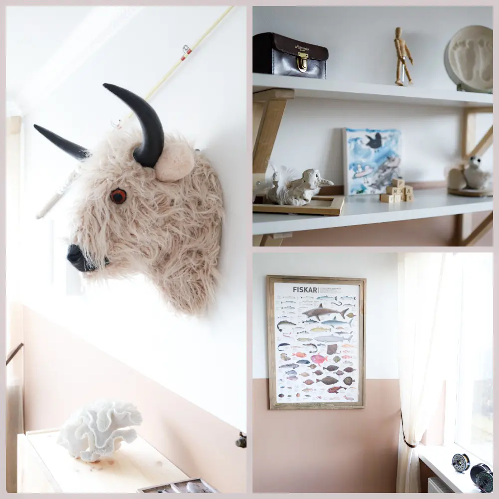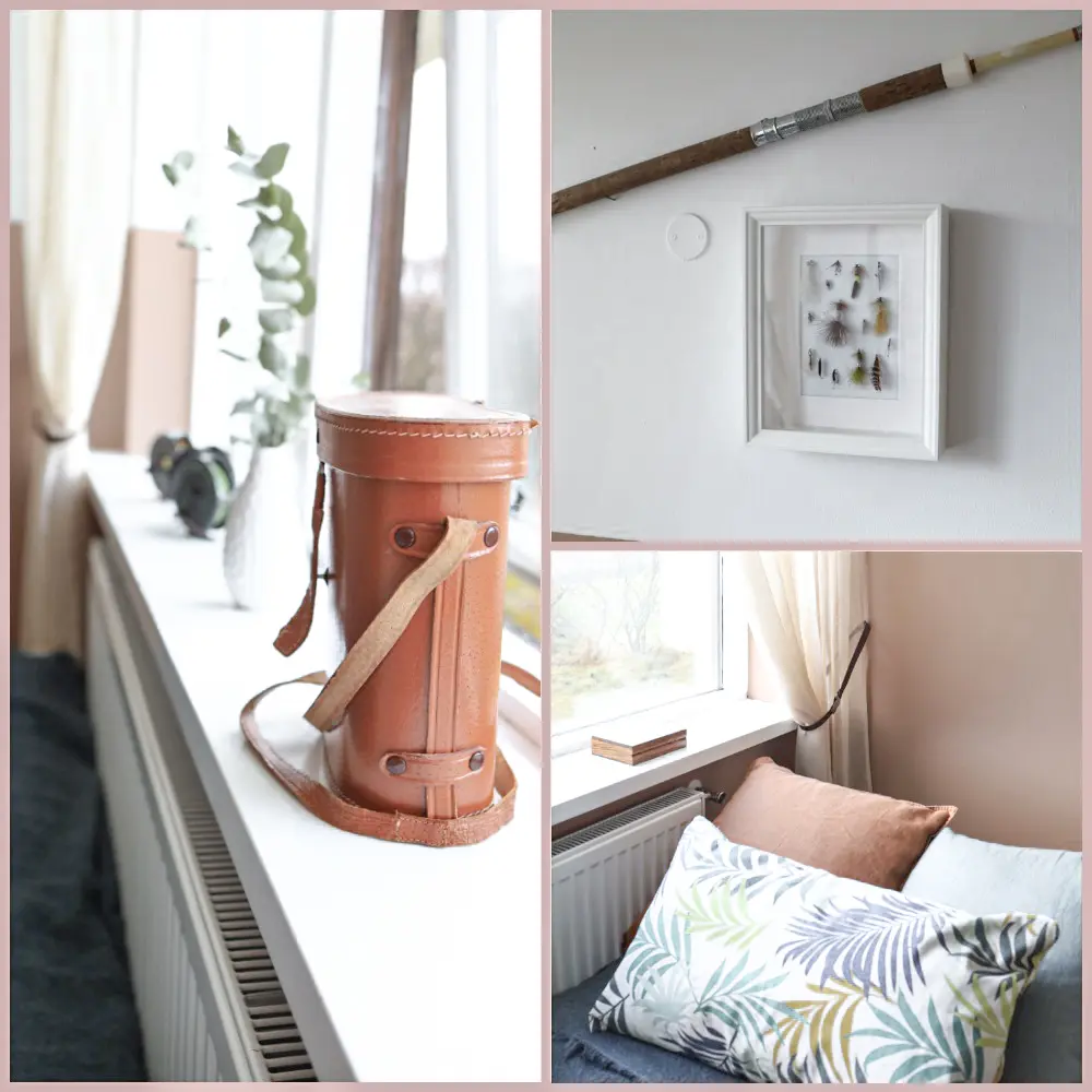 Mér finnst gaman að sjá þemað í herberginu hans en við fundum til gamla erfðagripi eins og sjórængjaskip, sjónauka, veiðistangir og veiðihjól sem dæmi sem við notum til skrauts.