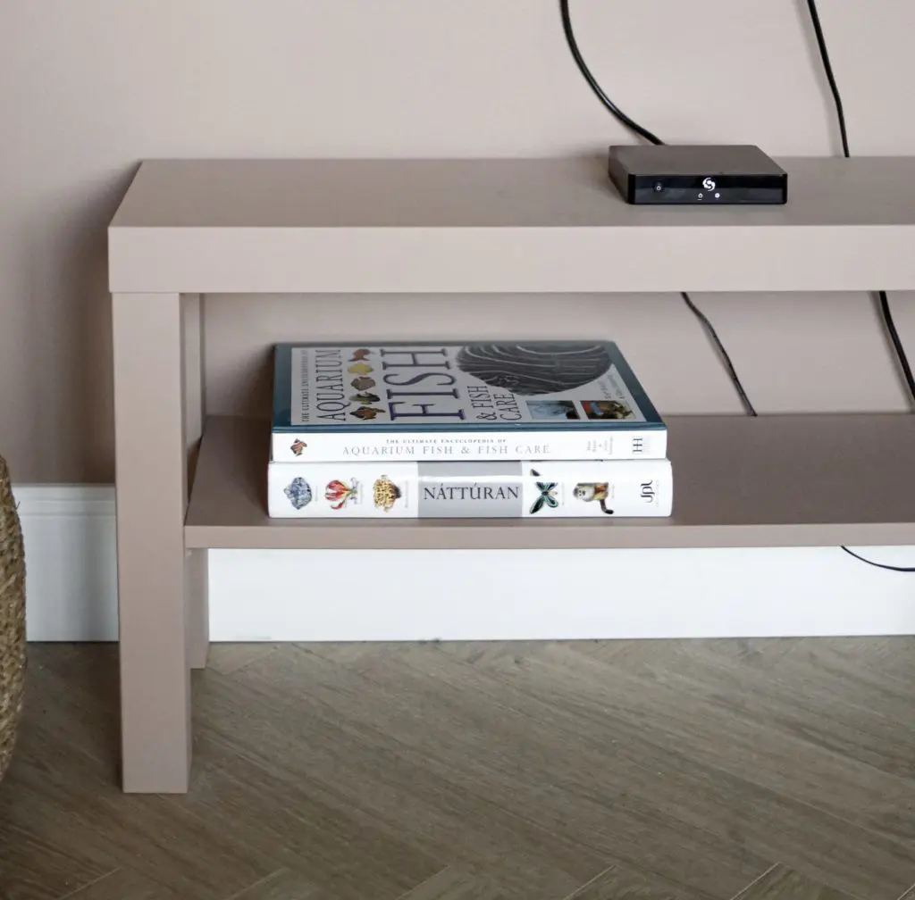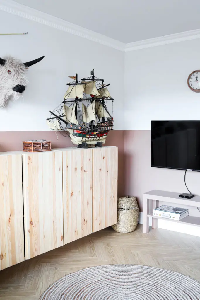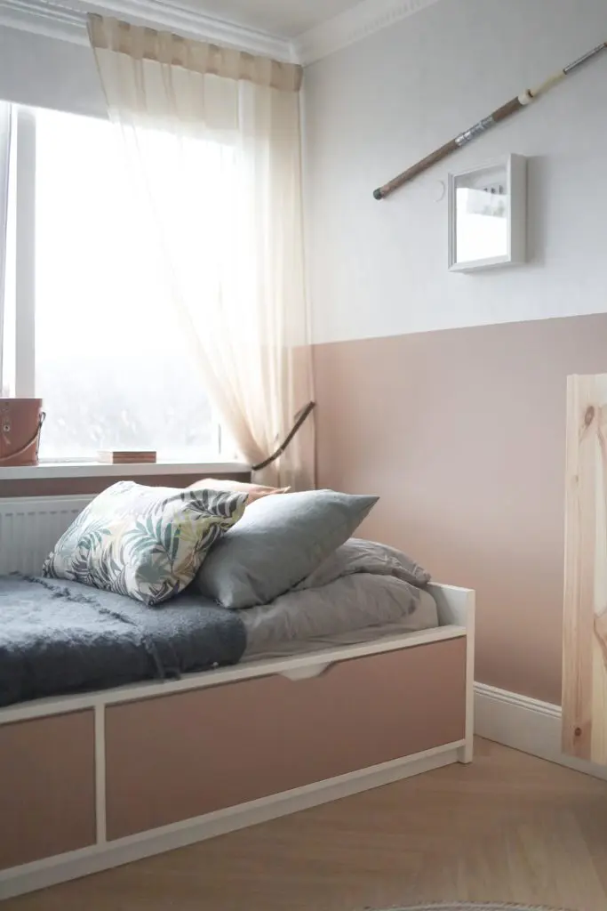 Liturinn heitir Terracotta Light en við máluðum skúffurnar á rúminu í sama lit og veggina, sem og lítið sjónvarpsborð sem notað er undir leikjatölvur og sjónvarp.
