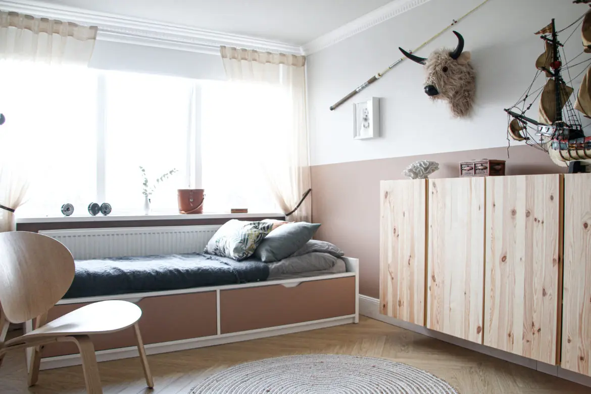Liturinn heitir Terracotta Light en við máluðum skúffurnar á rúminu í sama lit og veggina, sem og lítið sjónvarpsborð sem notað er undir leikjatölvur og sjónvarp.