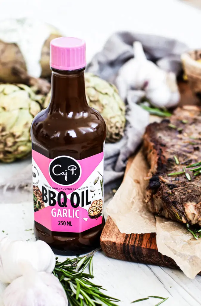 Aðal uppistaðan í marineringunni er hvítlauksolían frá Caj P, en ég elska grillolíurnar frá þessu merki. Marinn hvítlaukur og ferskt rósmarín með gerir þetta upp á 100.