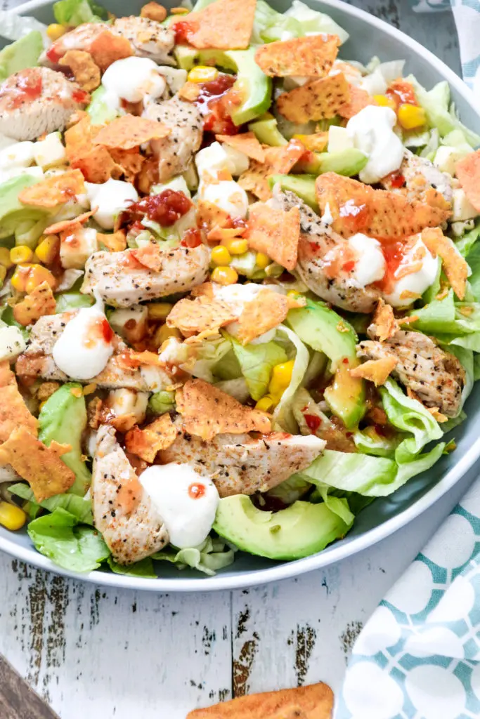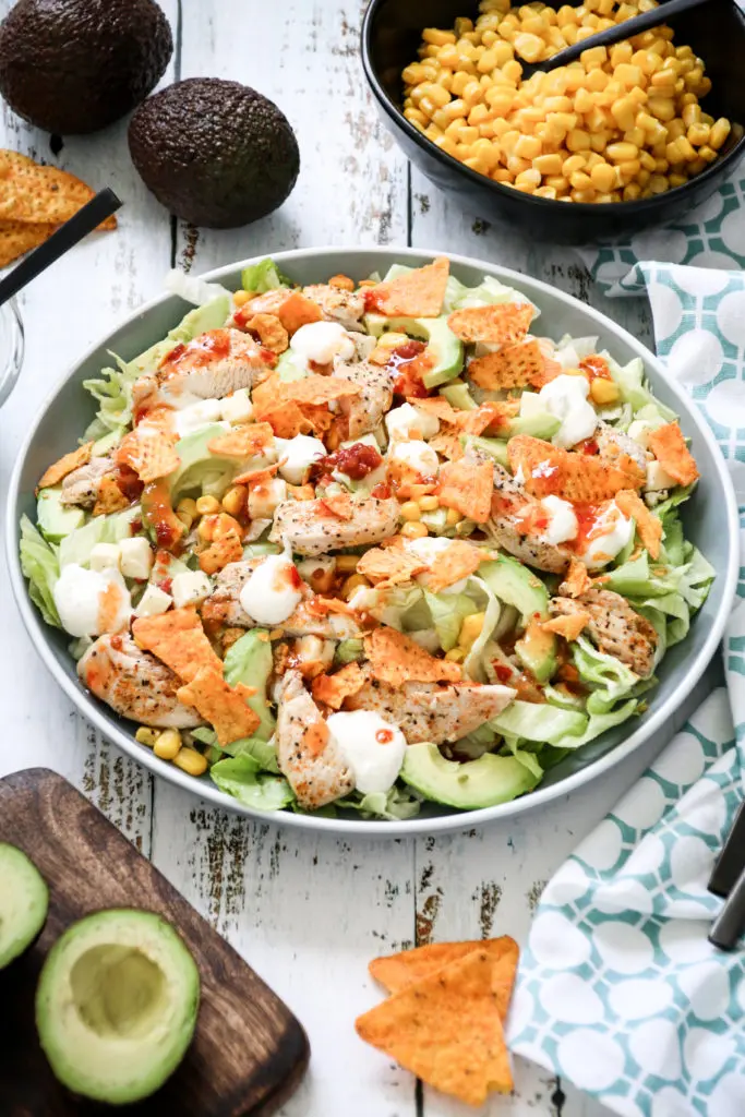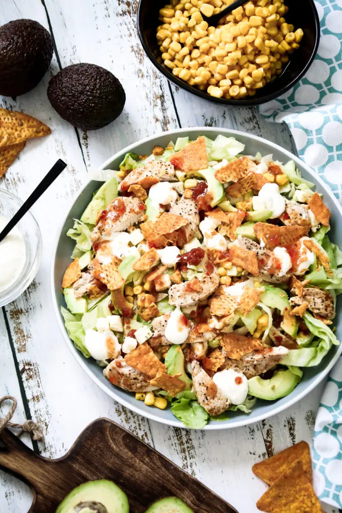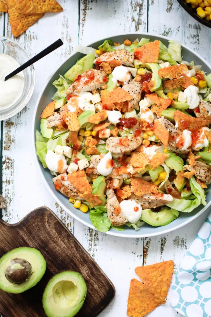 Ég mæli með að þið gerið salatið um leið og á að borða það og best er að gera salat á einn stóran disk eða á hvern disk fyrir sig en ég lagskipti því. Svo er möst að hafa auka sýrðan, salsa sósu og sweet chili sósu á borðinu ef ykkur langar að bæta á salatið.