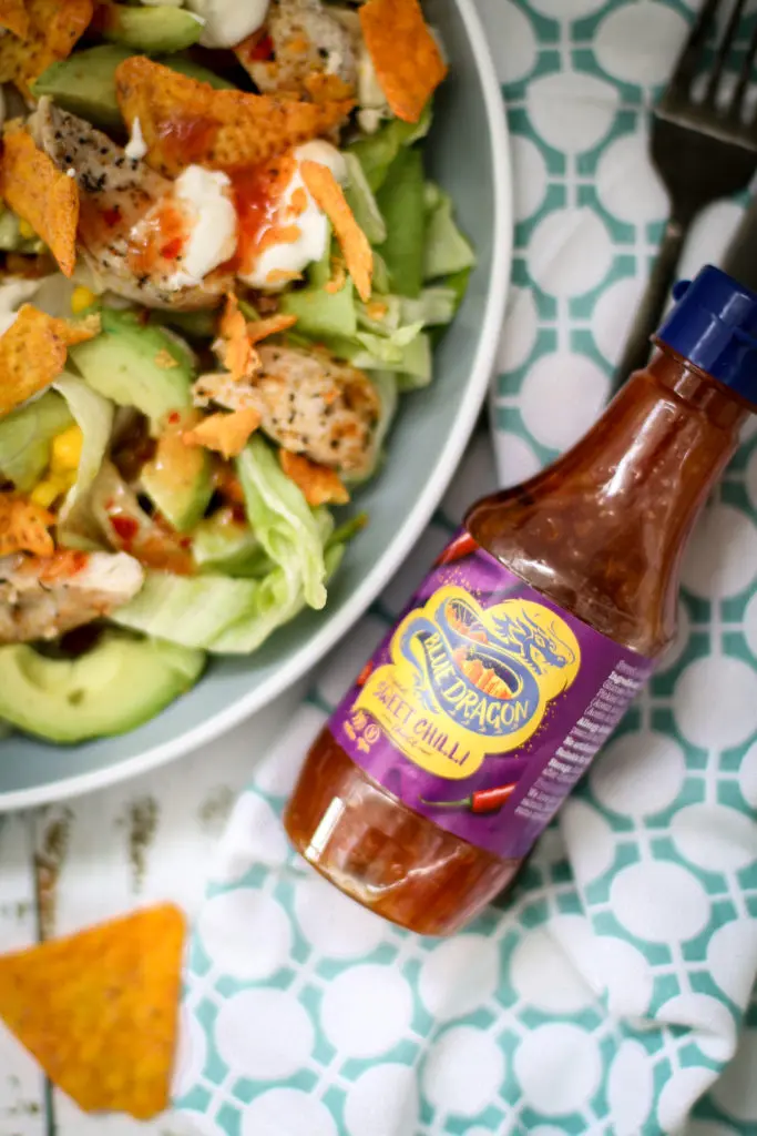 það sem er kannski smá sérstakt við þetta salat er að í því eru hráefni sem maður tengir við Mexíkó, allt nema eitt, sem maður myndi frekar tengja við kínverskan mat eða sweet chili sósa frá Blue Dragon.