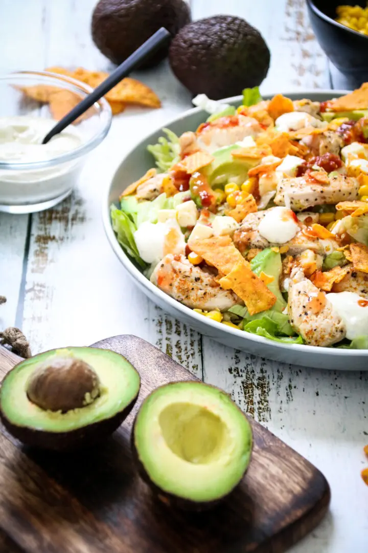 Ég mæli með að þið gerið salatið um leið og á að borða það og best er að gera salat á einn stóran disk eða á hvern disk fyrir sig en ég lagskipti því. Svo er möst að hafa auka sýrðan, salsa sósu og sweet chili sósu á borðinu ef ykkur langar að bæta á salatið.
