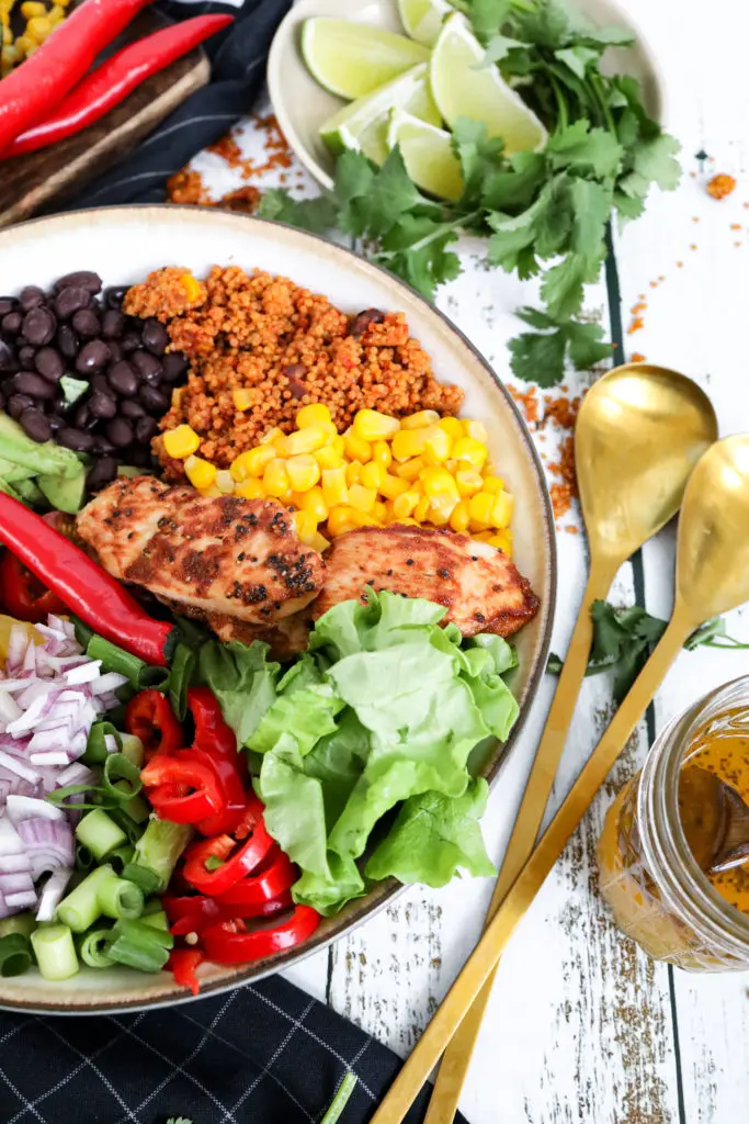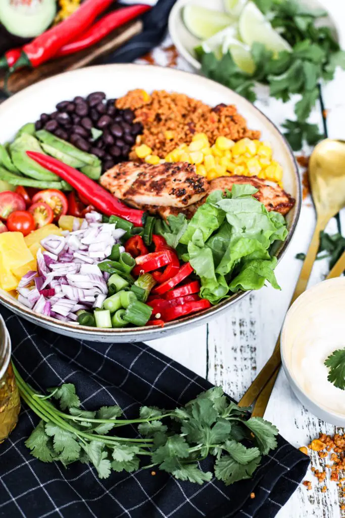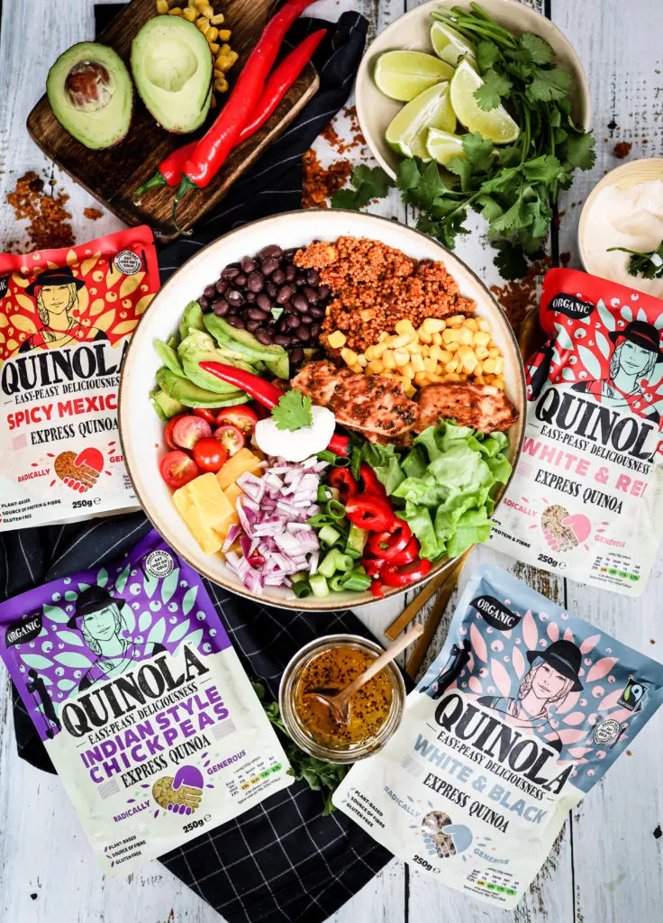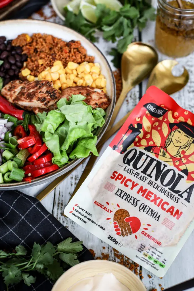 Hér er svo sannarlega um hollan skyndibita að ræða en þessa skál tekur enga stund að gera. Þrátt fyrir quinoa og kjúkling sem þarf að elda með dásamlegum kryddlegi.