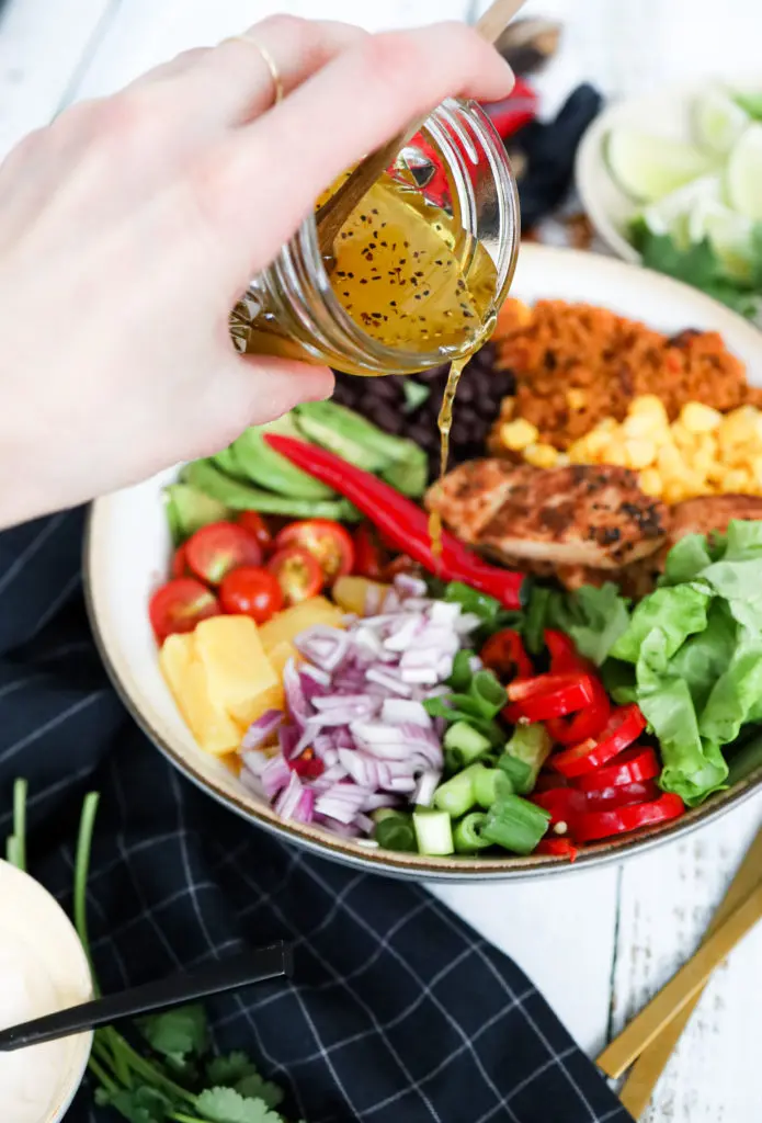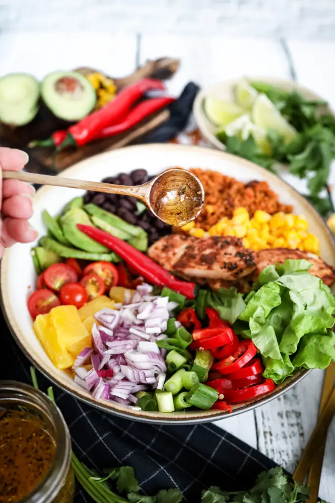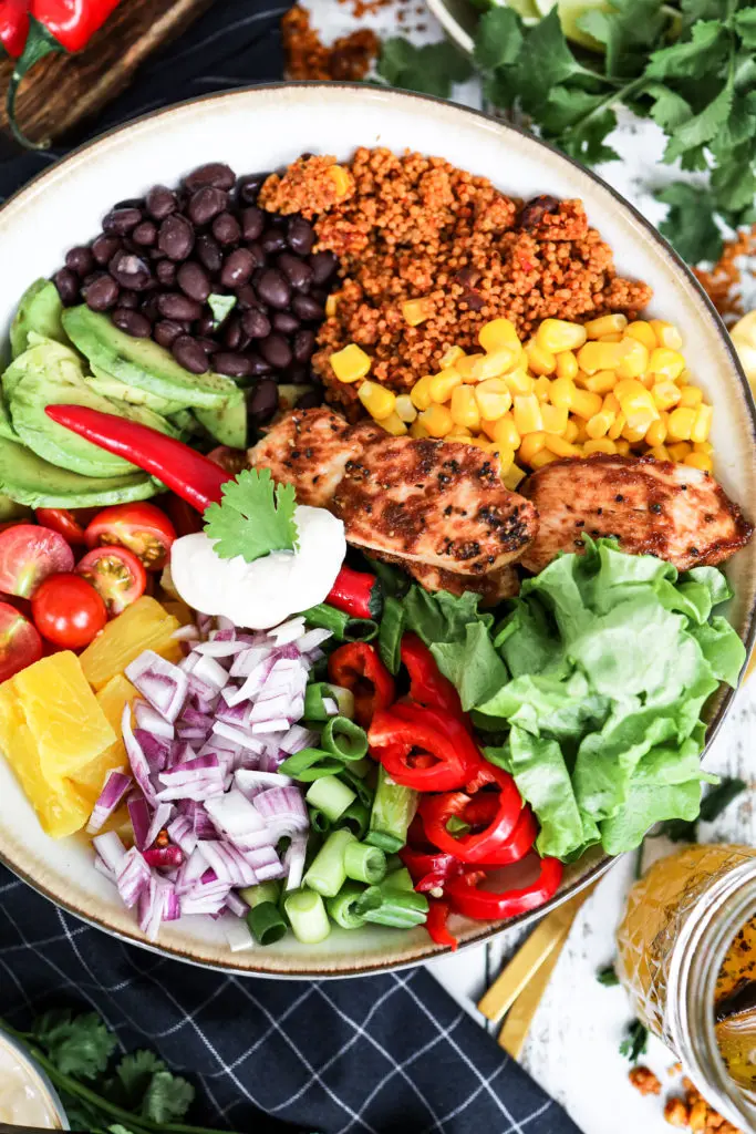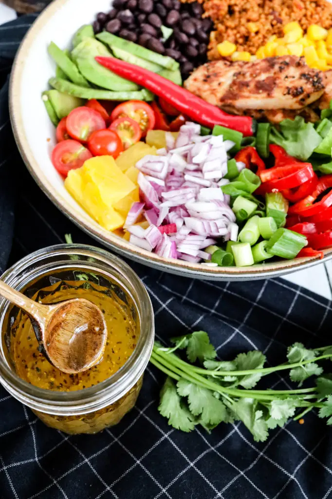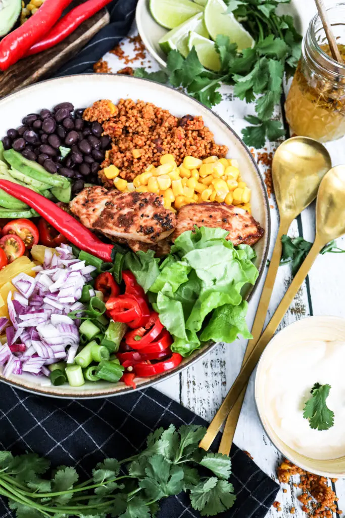 Hér er svo sannarlega um hollan skyndibita að ræða en þessa skál tekur enga stund að gera. Þrátt fyrir quinoa og kjúkling sem þarf að elda með dásamlegum kryddlegi.