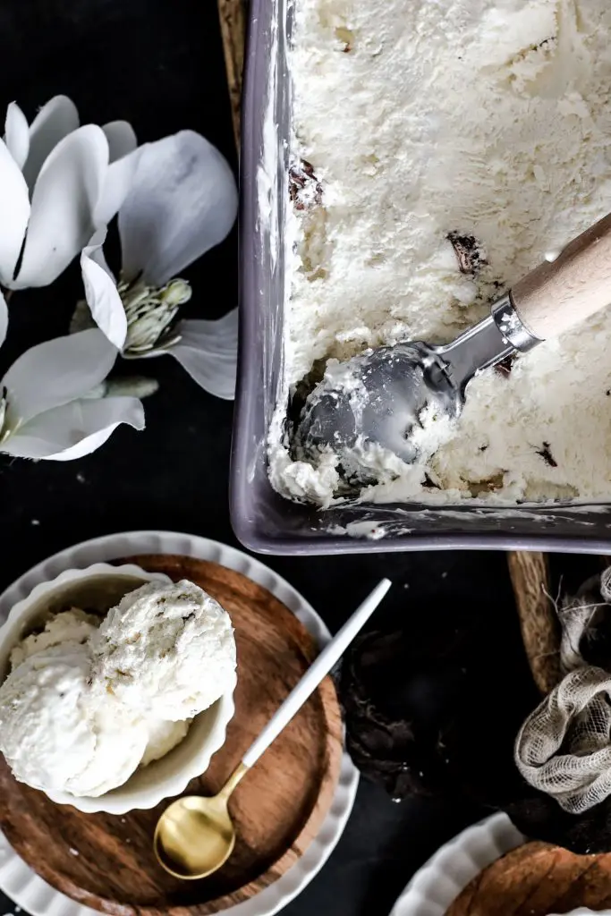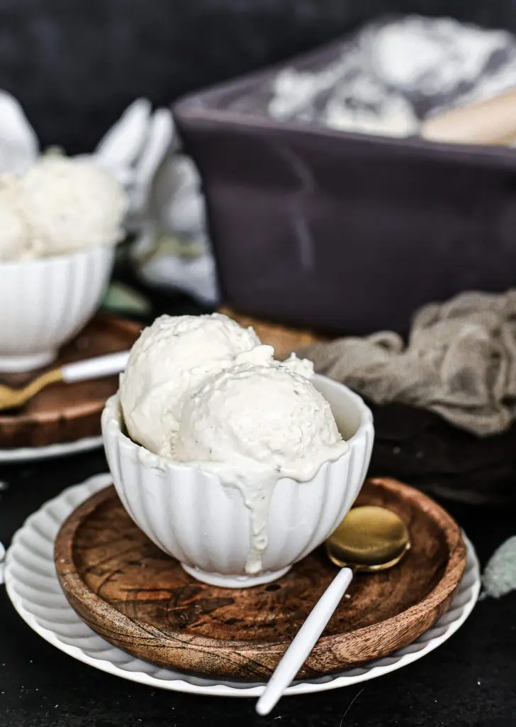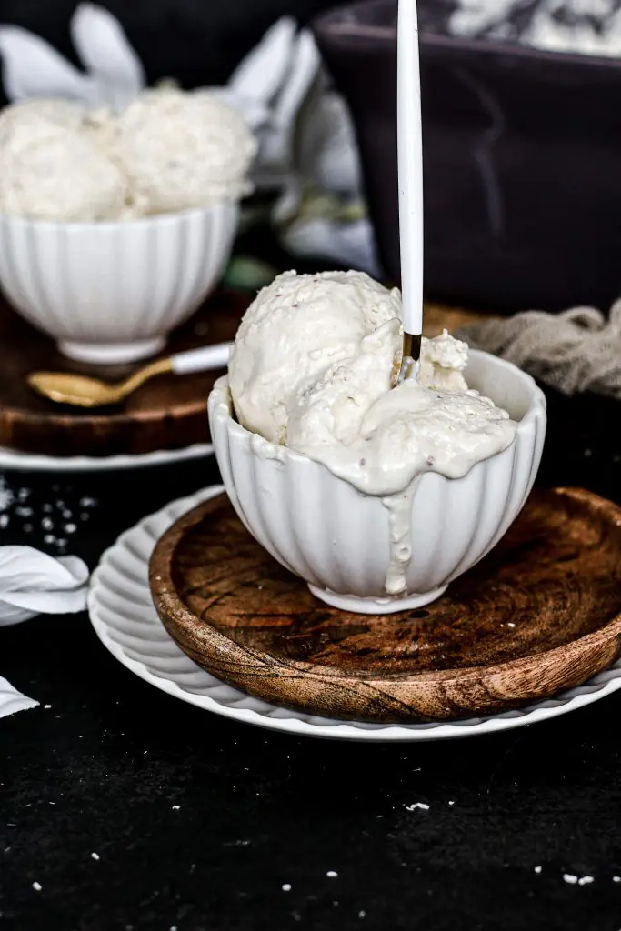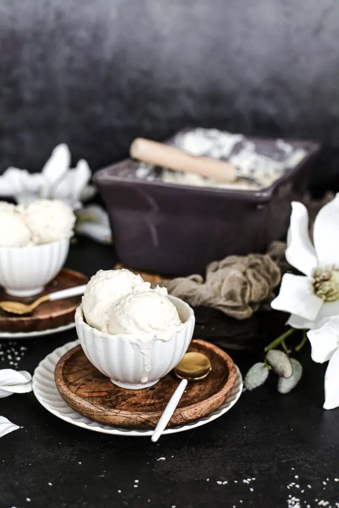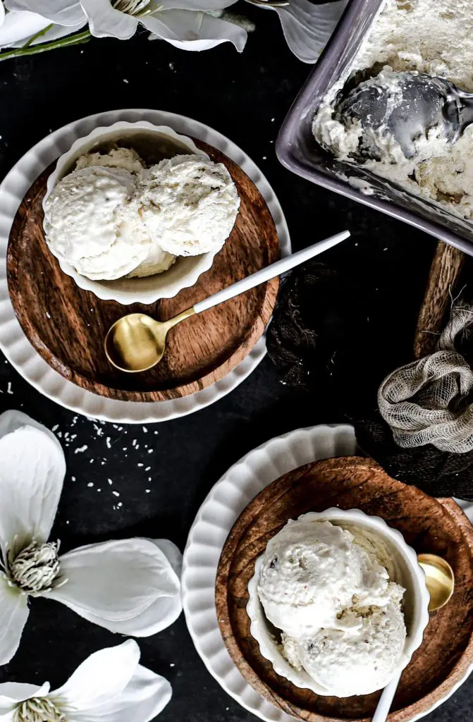 Hér er dásamlega silkimjúkur og bragðgóður kókós ís sem er bæði eggja og mjólkurlaus sem allir ættu að geta notið.