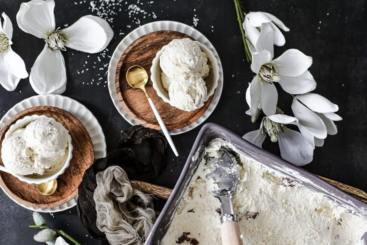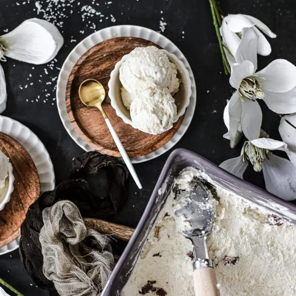 Hér er dásamlega silkimjúkur og bragðgóður kókós ís sem er bæði eggja og mjólkurlaus sem allir ættu að geta notið.