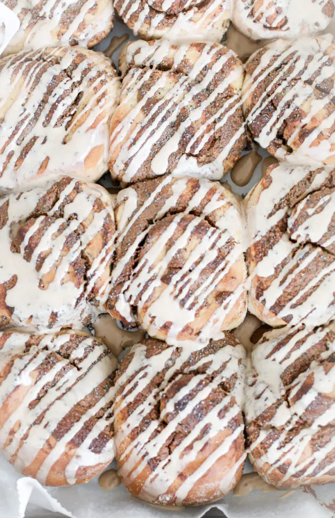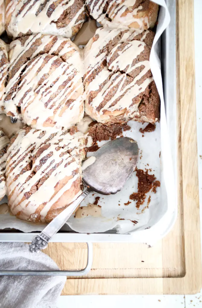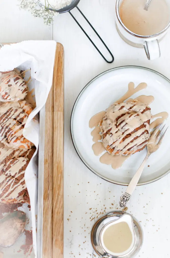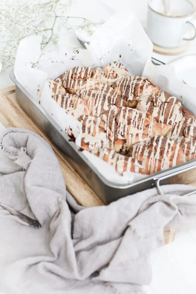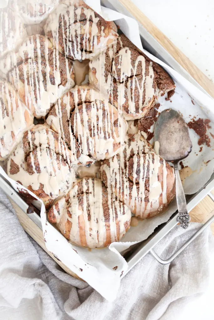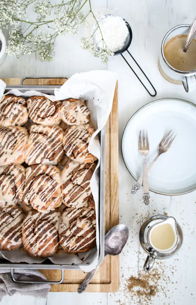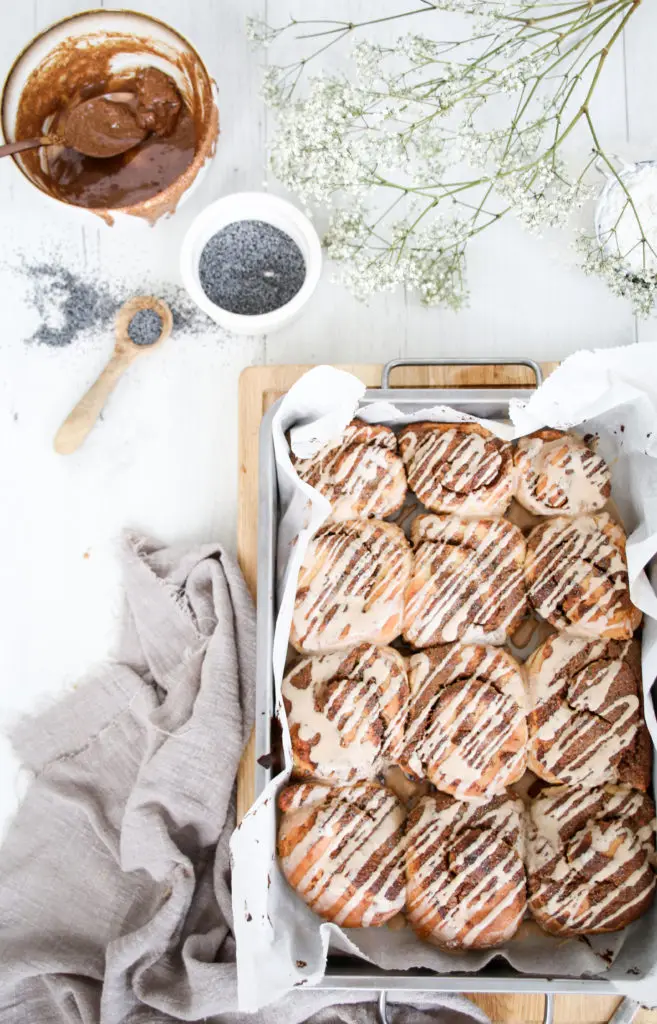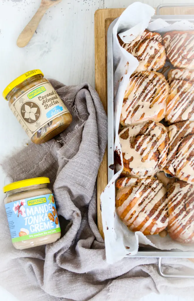 Snúðarnir eru léttir og loftkenndir og fylltir með dásamlegu lífrænt ræktuðu kókóshnetu og möndlusmjöri, blandað saman við kanil.