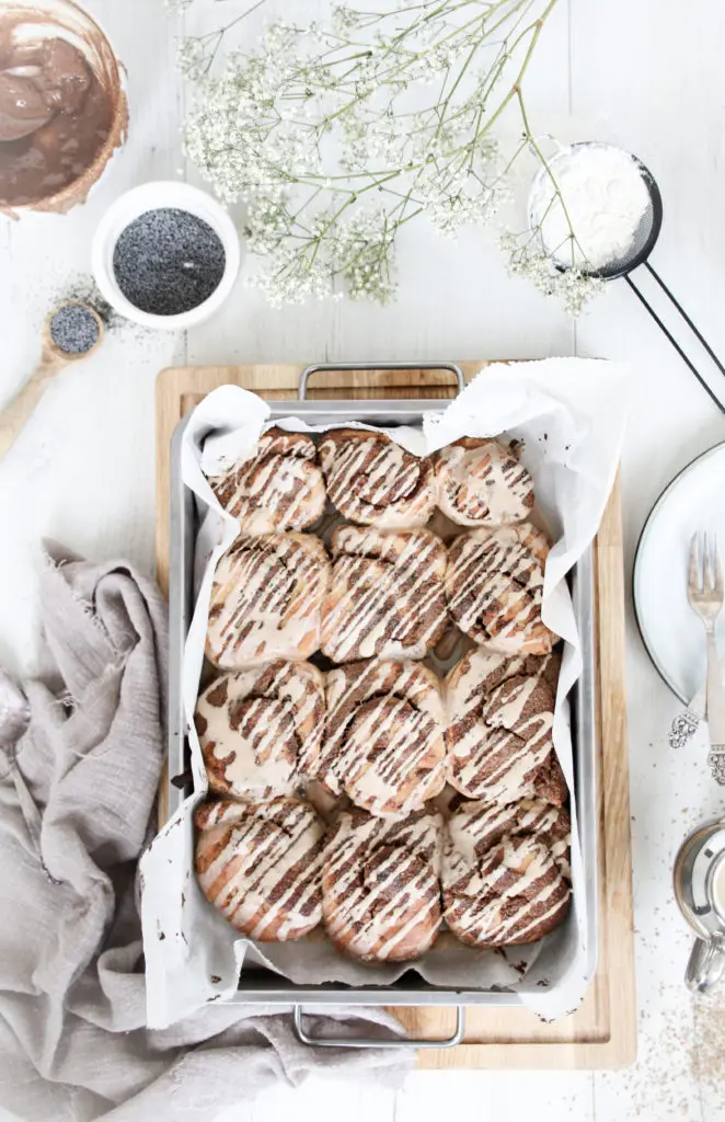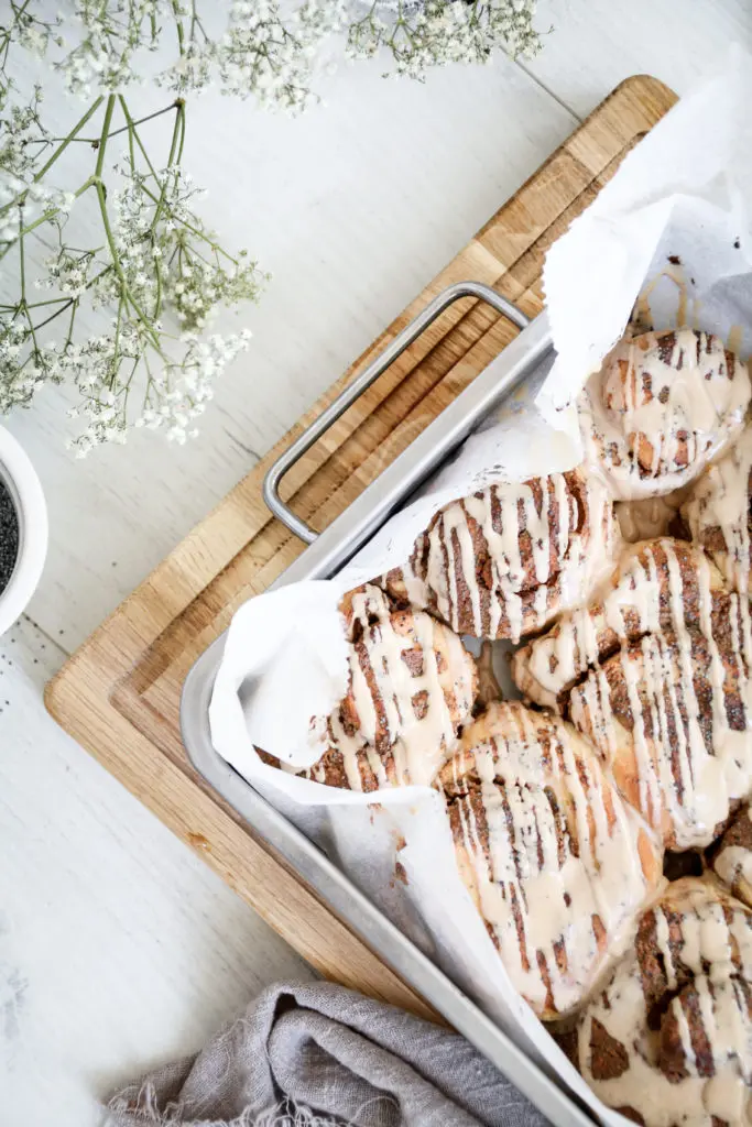 - Smyrjið næst fyllingunni á deigið og sáldrið 1,5 msk af valmúgafræum yfir