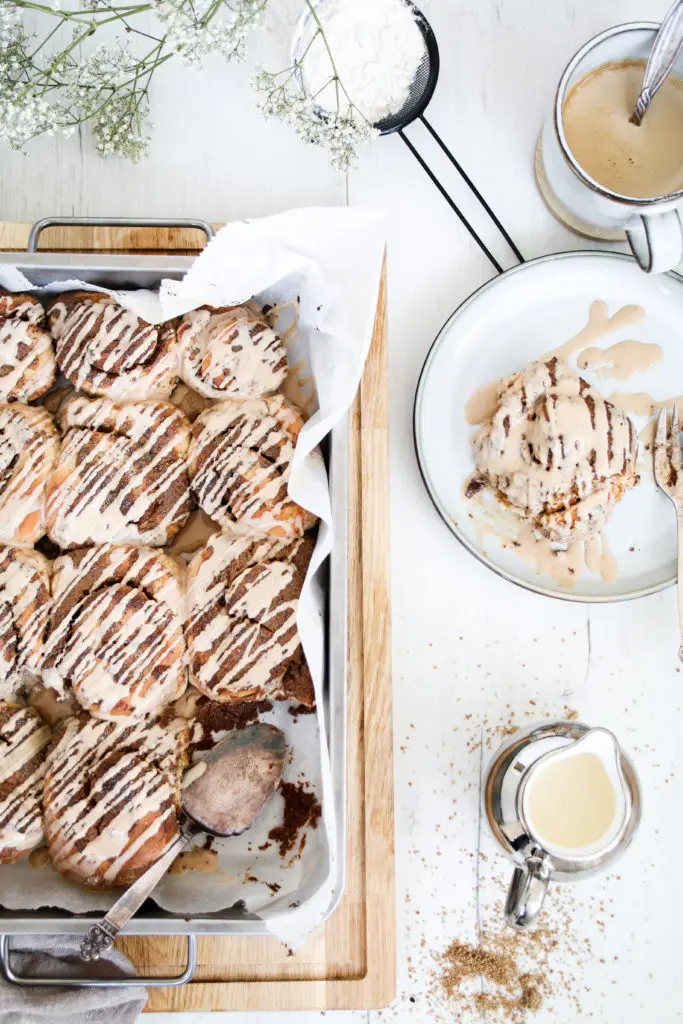 Best er að baka snúðana í góðu eldföstu móti og hafa ögn bil á milli þeirra þegar þeim er raðað í mótið því þeir hefast enn meir í ofni og blása út. Ég mæli með að bera snúðana fram sjóðheita og setja kremið strax á þá. Afgang má svo hita upp í örbylgju á 20-30 sekúndur og þá verða þeir sem nýjir. Pressuger er notað í snúðana en það er yfirleitt að finna í kæli verslana