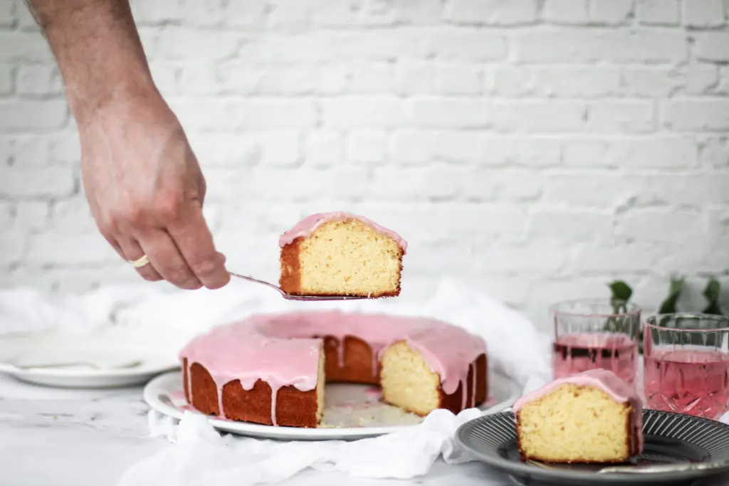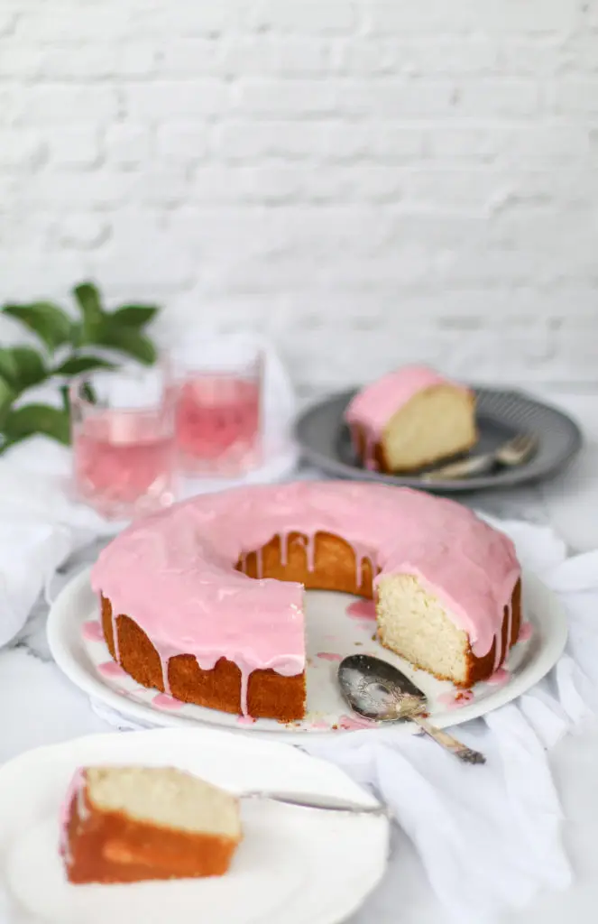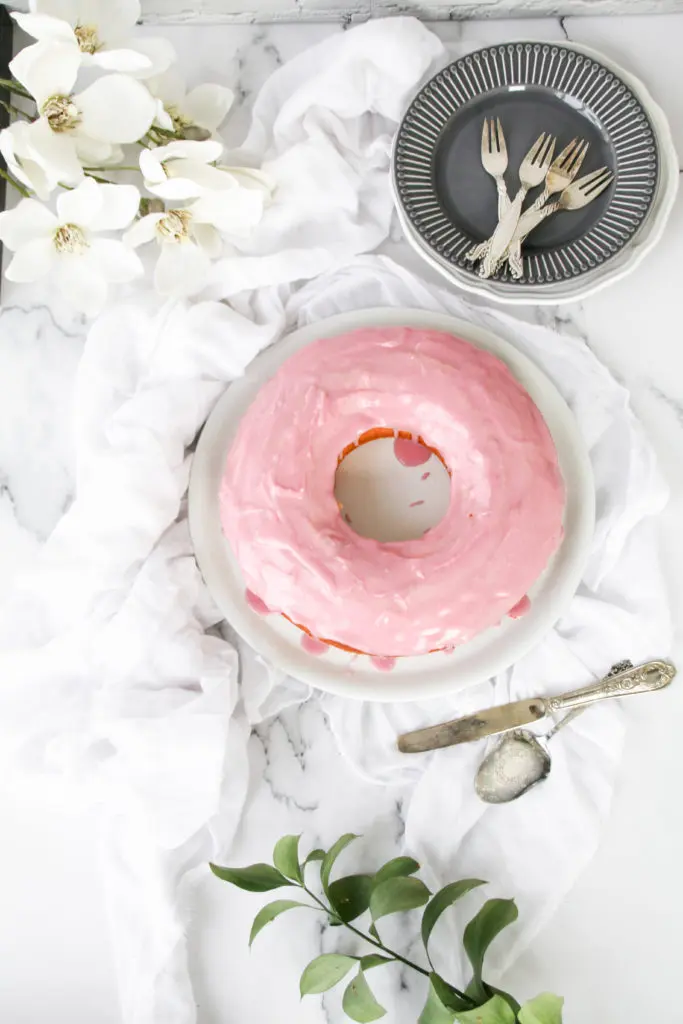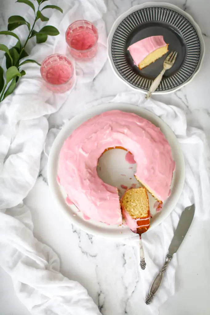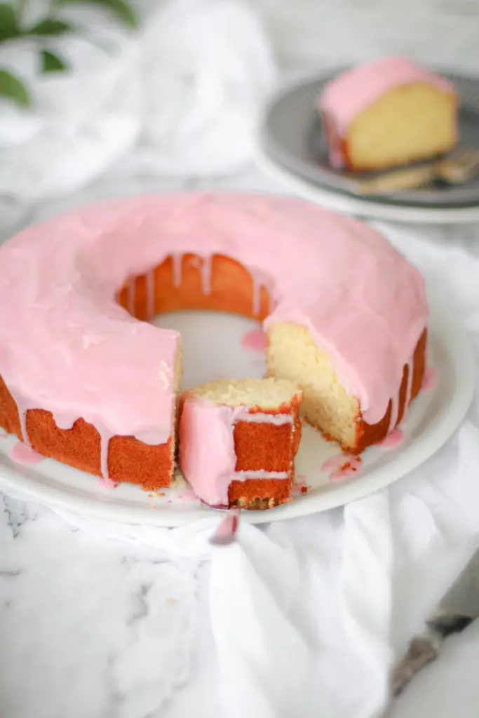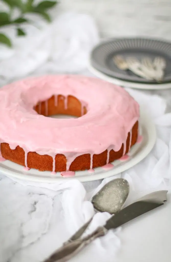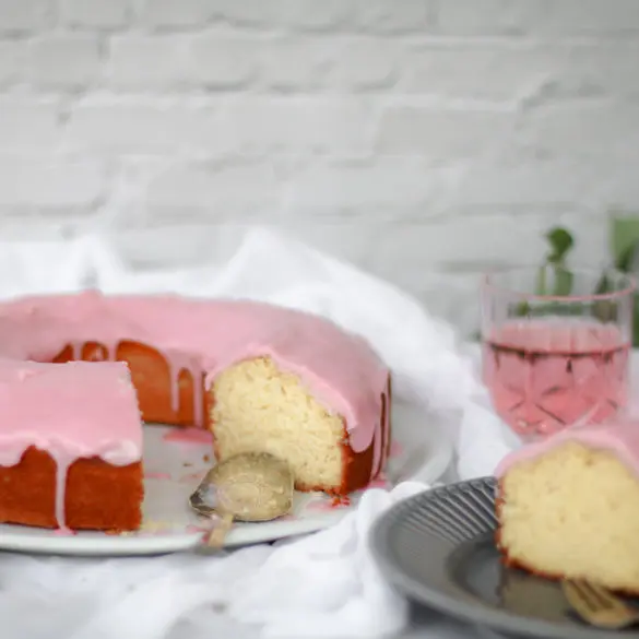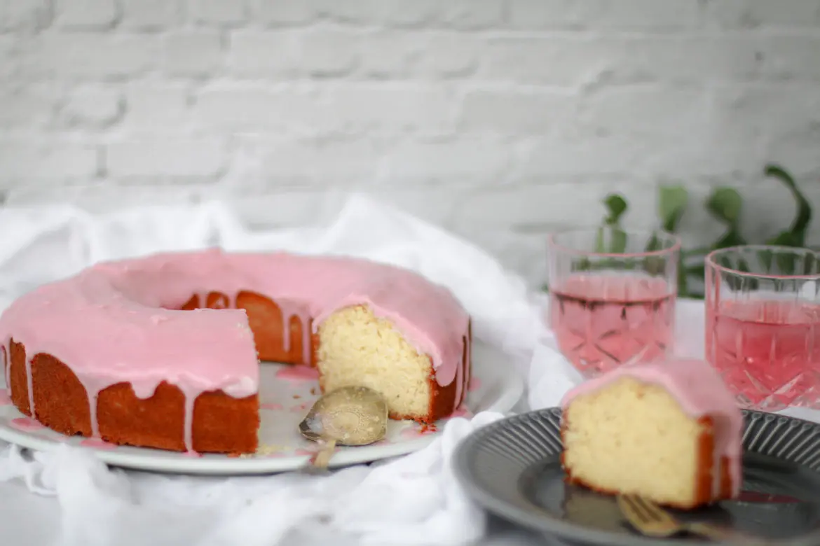 Glassúrinn er síðan skemmtilega öðruvísi en hann inniheldur Ribena safa sem gerir kremið fallega bleikt og því þarf engan matarlit. Auk þess gerir Ribena bragðið sem rétt nær að skína í gegn að gera töfra með möndlubragðinu.
