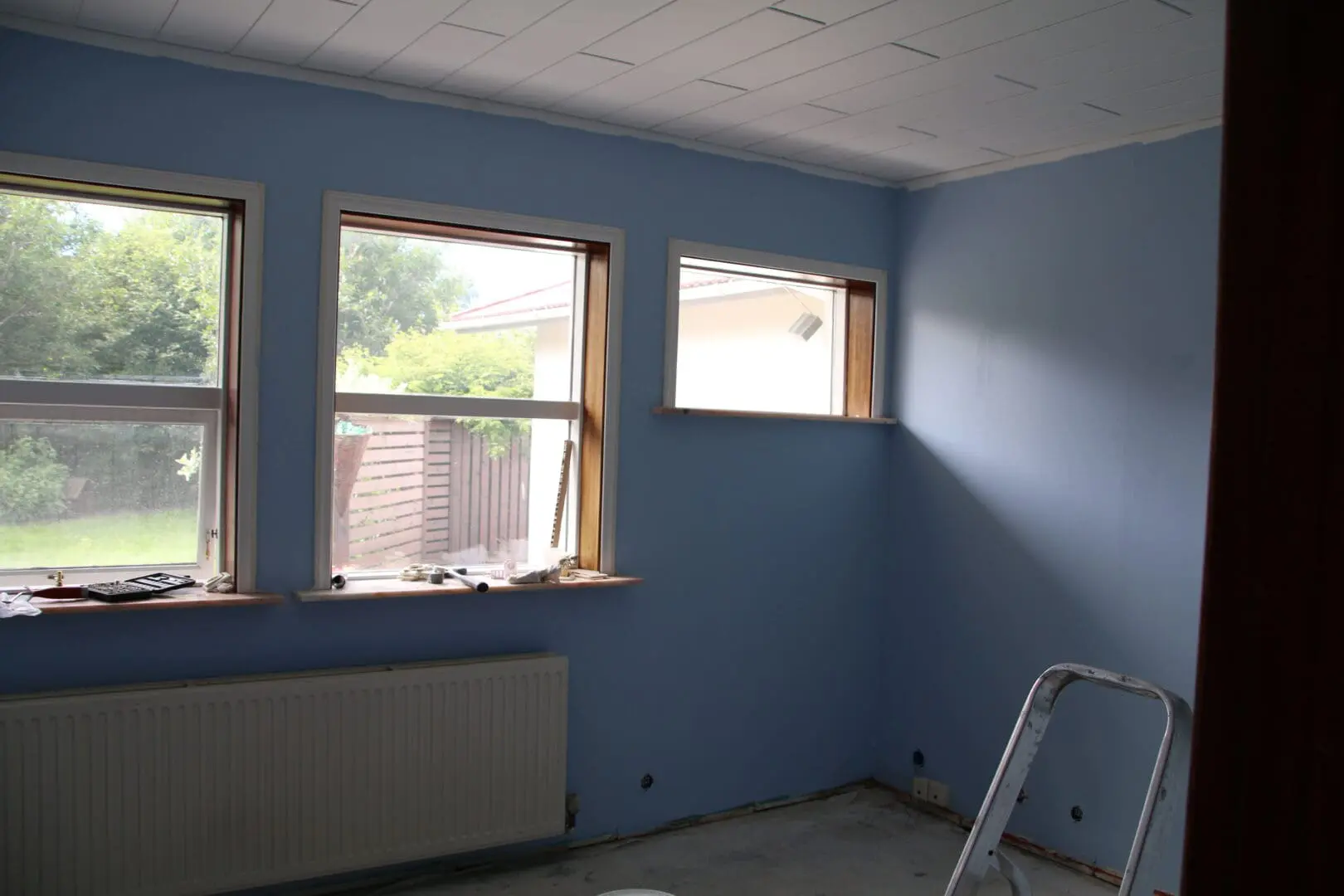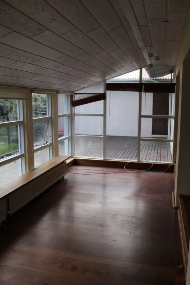 Í sólstofunni tók þessi langi stóri ofn alltof mikið gólfpláss svo hann var tekinn í burtu, og með því stækkaði sólstofan töluvert og nýttist því mun betur.